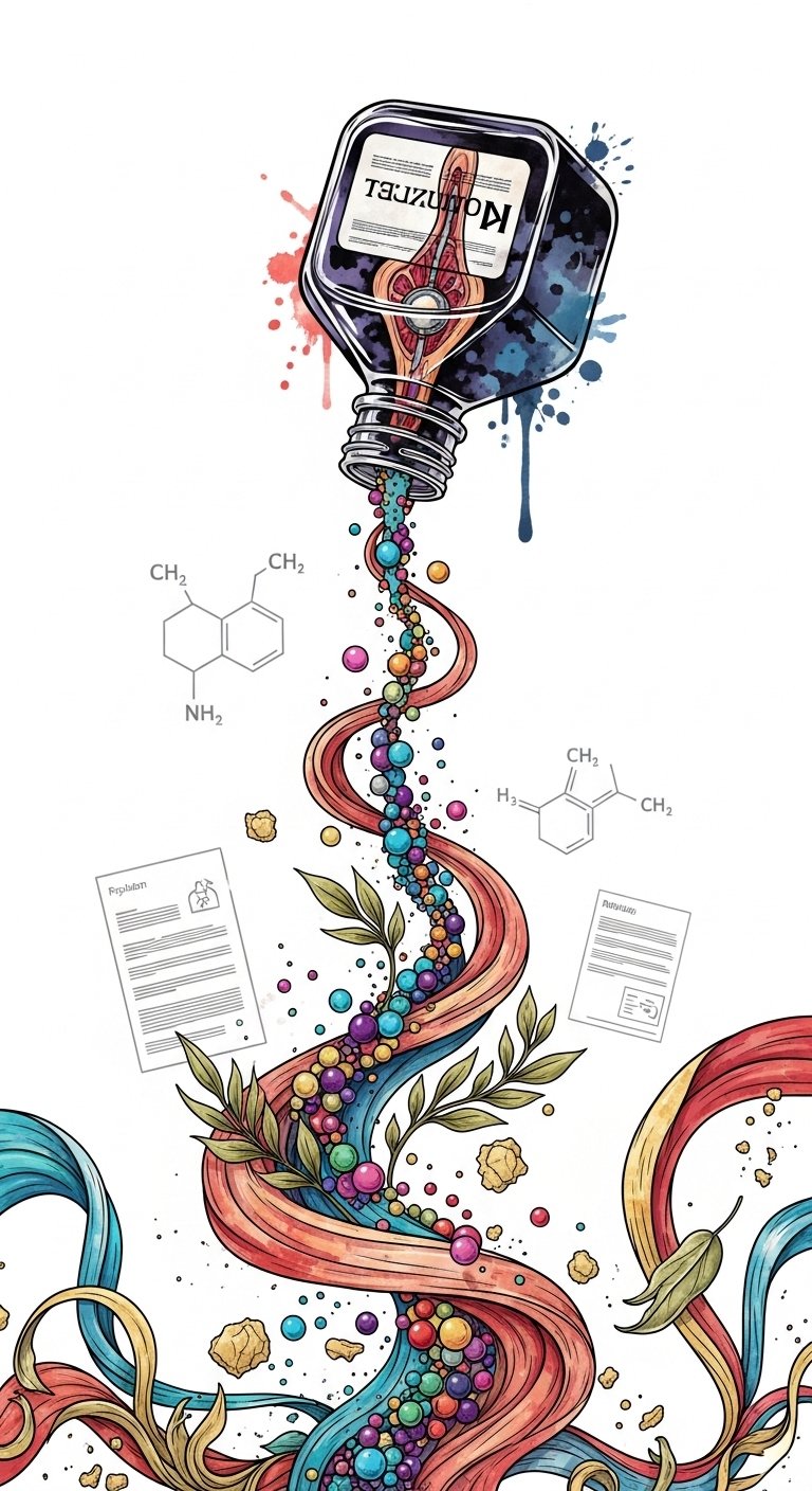 As a design, the swirling translucent pigments represent the promise of color stability and pigment transparency, while intertwined botanicals and geometric binders symbolize sustainable sourcing and innovative, biocompatible materials; the artisan bottle and recyclable packaging icons evoke craftsmanship and eco-conscious commitment.