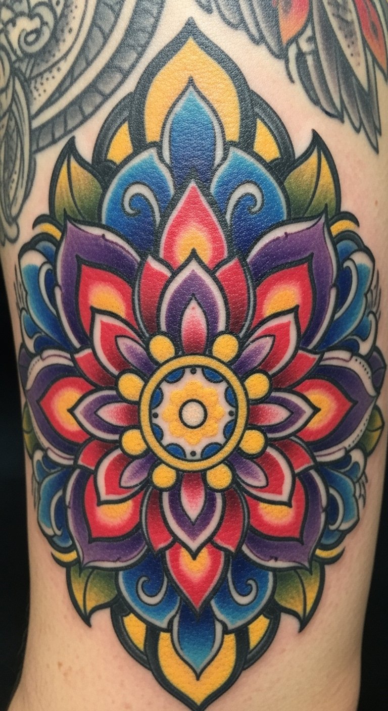 Cultural motifs and mixed techniques provide narrative depth, making the tattoo both meaningful and expressive.
