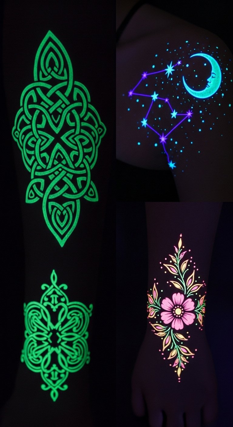 A design concept centered on layered phosphorescent floral vines that wrap gently around the forearm or calf; in daylight the linework appears as soft gray and muted color, but when charged the vines bloom in gradient neon greens and blues, highlighting petals and veins to emphasize resilience and renewal. Symbolically the glow represents hidden inner strength and the chemistry of change—how exposure to light fuels transformation—while the muted daytime appearance speaks to quiet dignity. Emotionally it balances intrigue and serenity, chosen for curved placements like the forearm, ribcage, or side of the thigh to maximize both visibility in low light and personal intimacy, with attention to safe ink choice and placement for longevity.