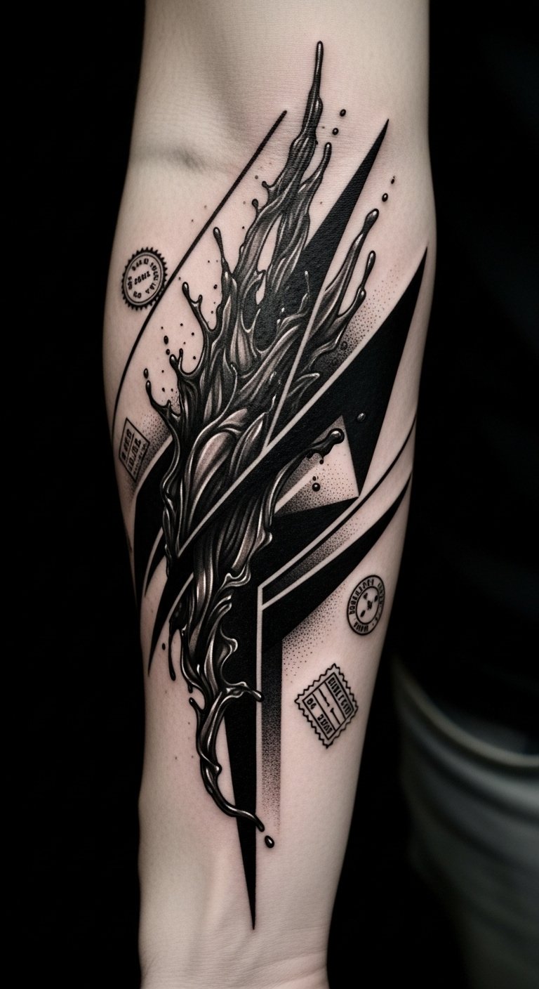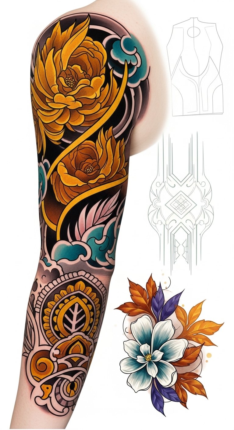 A flowing sleeve design combining organic and geometric elements: watercolor washes of organic pigments blending into crisp, inorganic-line constellations, with subtle skin-tone gradients and glossy highlights to suggest moisture and healing. Symbolically, the watercolor represents personal expression and emotional depth while the geometric constellations reflect precision, longevity, and the science behind pigment choices; together they evoke harmony between art and care. Emotionally it balances spontaneity and intention, encouraging mindful decisions about visibility and upkeep. Ideal placement is the outer forearm to allow visibility and easy aftercare, or the upper shoulder for a larger canvas and protection from sun exposure.