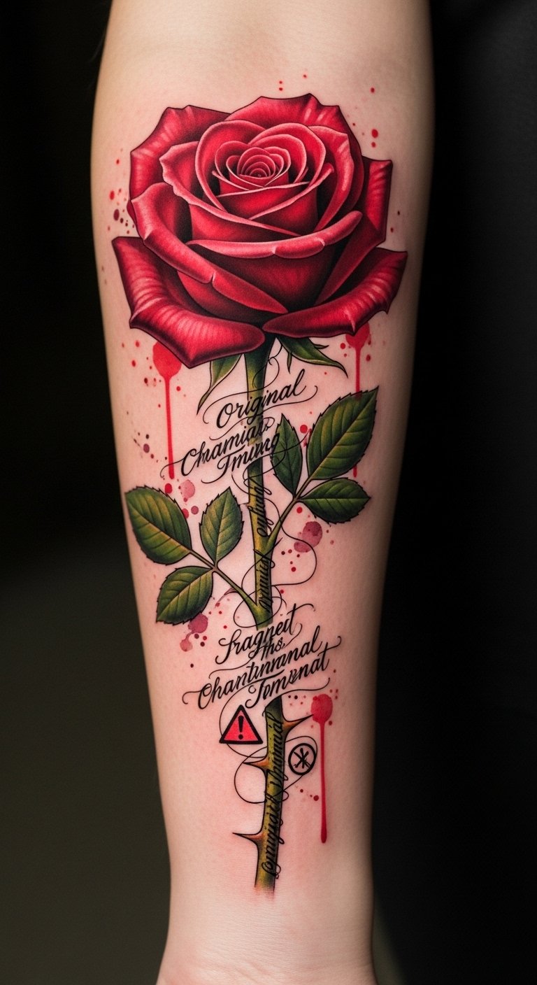 This design uses the rose to symbolize beauty and passion while the subtle irritation texture and warning motifs acknowledge risk; placing it on the forearm balances visibility for personal reflection and ease of monitoring for reactions, and the entwined script keeps the original text intimate yet integral to the imagery.