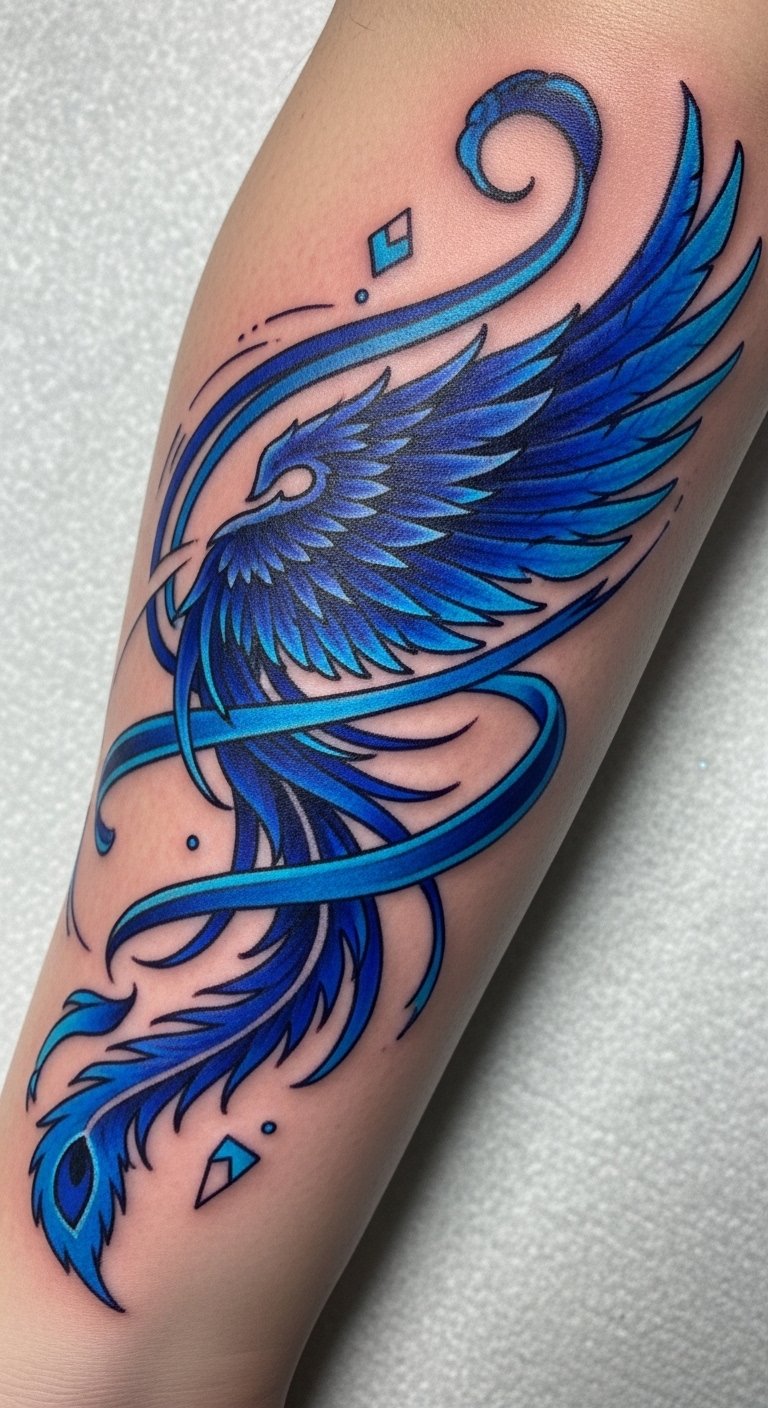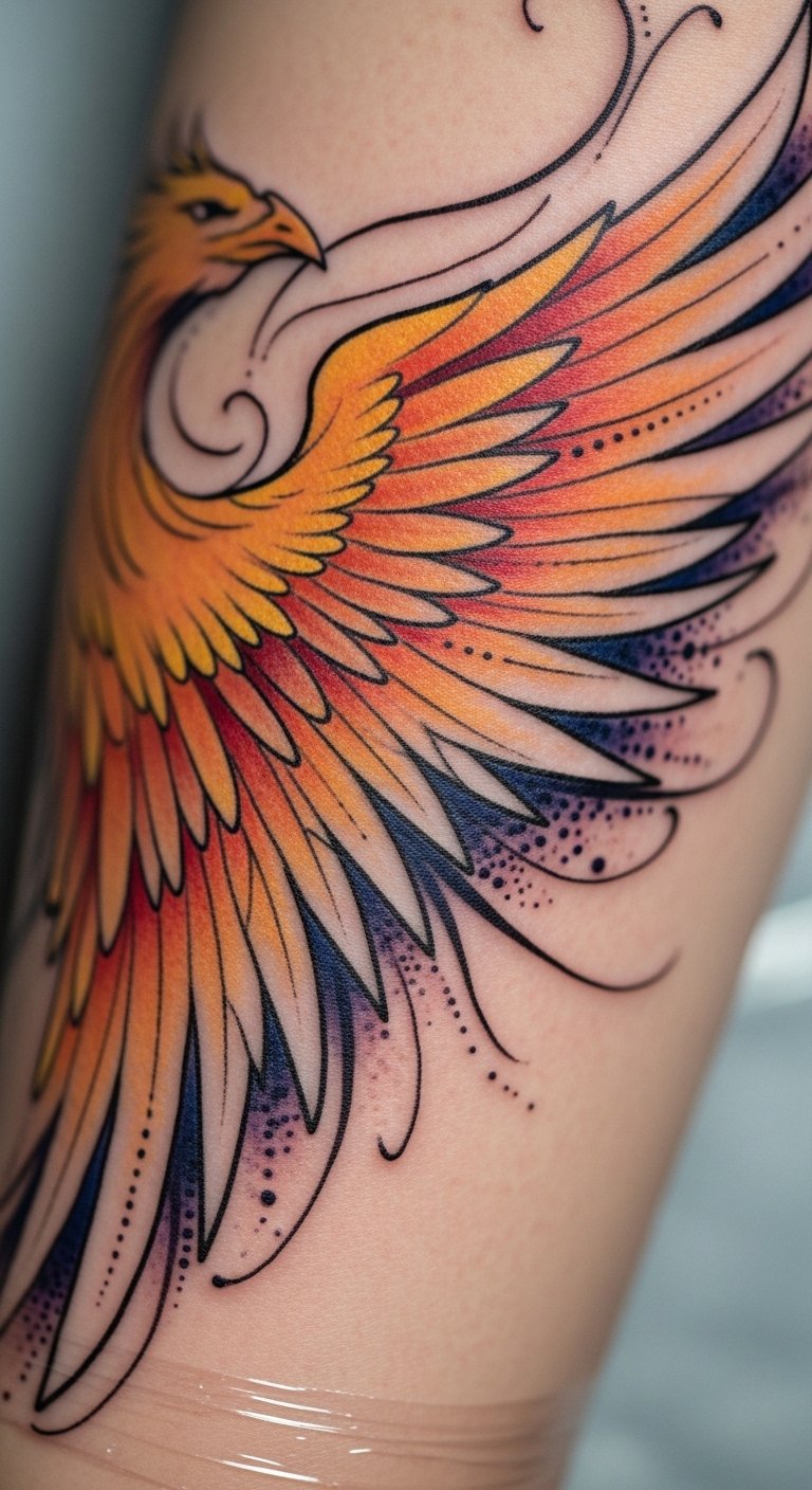 Embrace this transformation; it’s part of your journey, adding character and depth to your unique expression of freedom. The phoenix wing symbolizes rebirth and resilience, the visible pigment settling represents the personal process of healing and change, and the shifting colors evoke the emotional arc from initial intensity to deeper, mature expression.