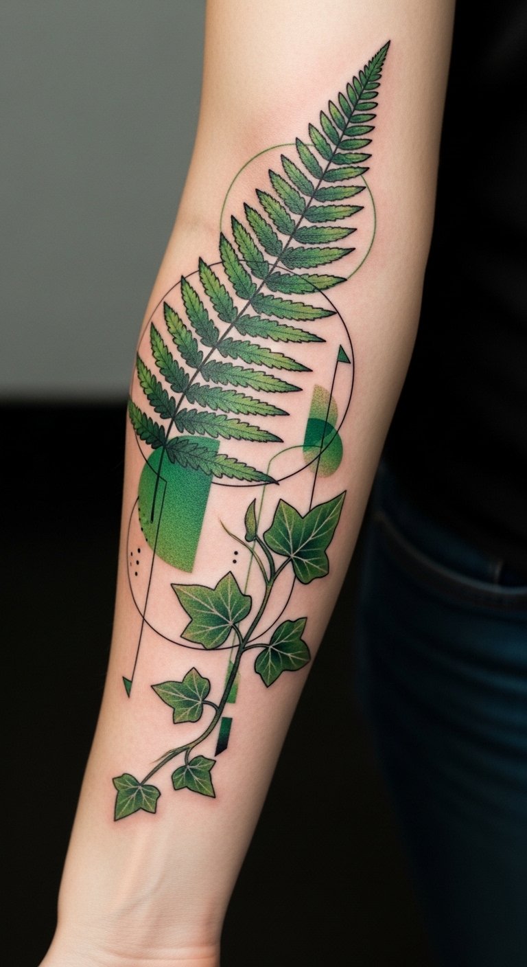 This design symbolizes growth, resilience, and personal freedom—fern fronds for renewal, ivy for connection and persistence, and geometric accents for balance; emotionally it evokes calm confidence and deliberate self-expression, best placed on the outer forearm where visibility supports affirmation while allowing easy care and monitoring for any skin sensitivity.