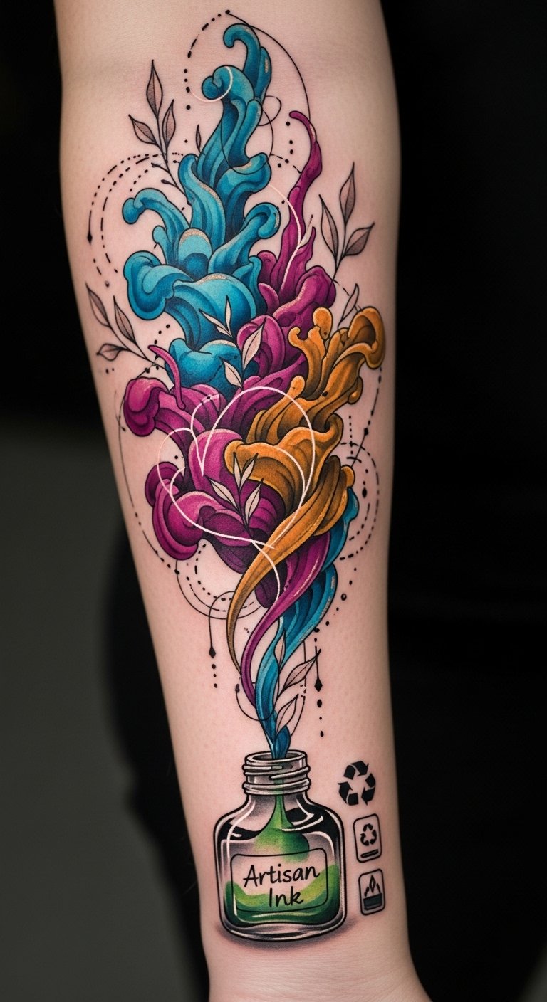 Embracing vibrant ink means understanding these elements and prioritizing your health alongside artistic expression. This design blends scientific detail and organic flow to symbolize the balance between artistry and safety; the pouring bottle represents creation and choice, the metallic flakes and chemical symbols nod to the unseen elements that give ink its power and potential risk, and the botanical motifs suggest healing and life.
