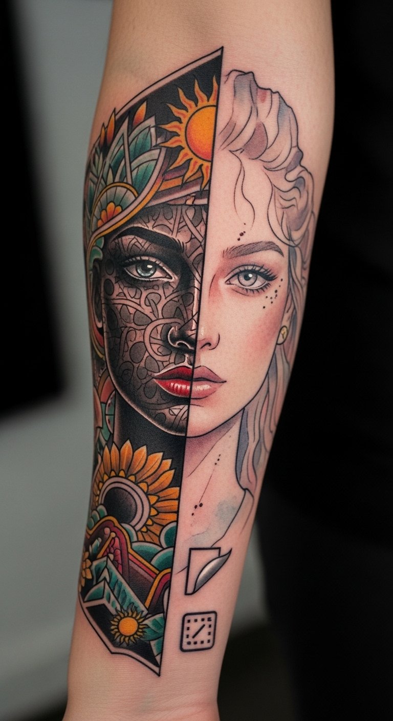 Ideal placement is the outer forearm so both halves are visible in daily life and can be shown or concealed easily; the transition line can align with natural muscle contours to emphasize harmony between permanence and impermanence.