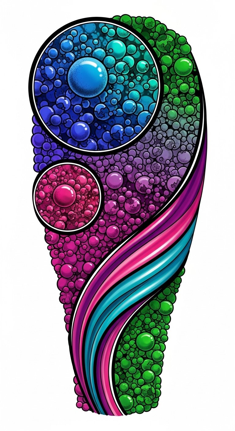 This design symbolizes endurance and precision: the microscopic particles represent the building blocks of lasting color while the flowing ribbons convey continuity and resilience. Emotionally it evokes confidence and meticulous care; ideal placement is along the forearm or calf where the wraparound flow can mirror the transition from microscopic detail to bold color, allowing both close-up appreciation and a dynamic visual statement from a distance.