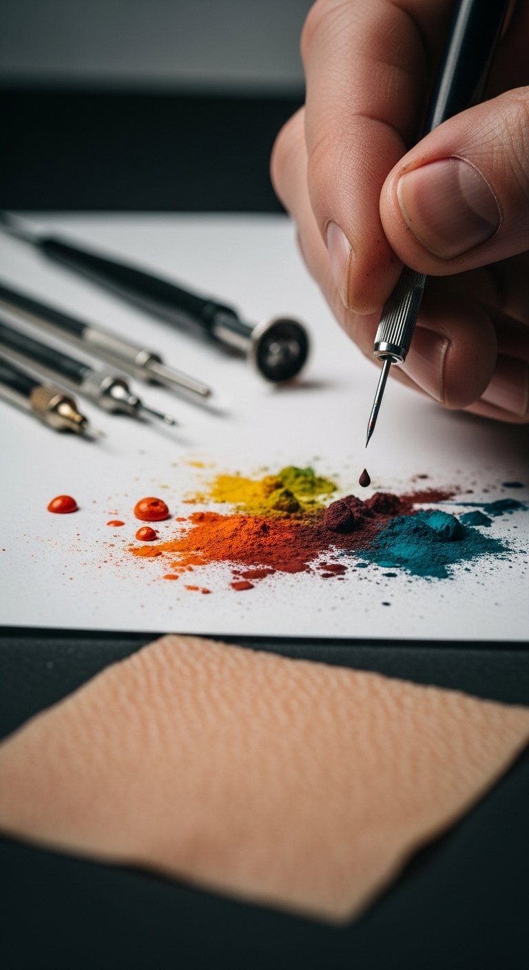 Building on the understanding of particle size and its impact on pigment stability, customizing colors through manual mixing techniques empowers tattoo artists to create unique shades that suit individual client preferences. By experimenting with color blending, you can craft custom hues that resonate with personal stories and styles. This artistic freedom enhances your work, allowing each tattoo to embody a distinctive, vibrant expression of individuality. The imagery symbolizes craftsmanship, care, and the personal connection between artist and client; it evokes emotions of trust, creativity, and celebration of identity, suggesting placement on a forearm or upper back where the mixing process and resulting bespoke palette can be displayed as a narrative piece that invites conversation.