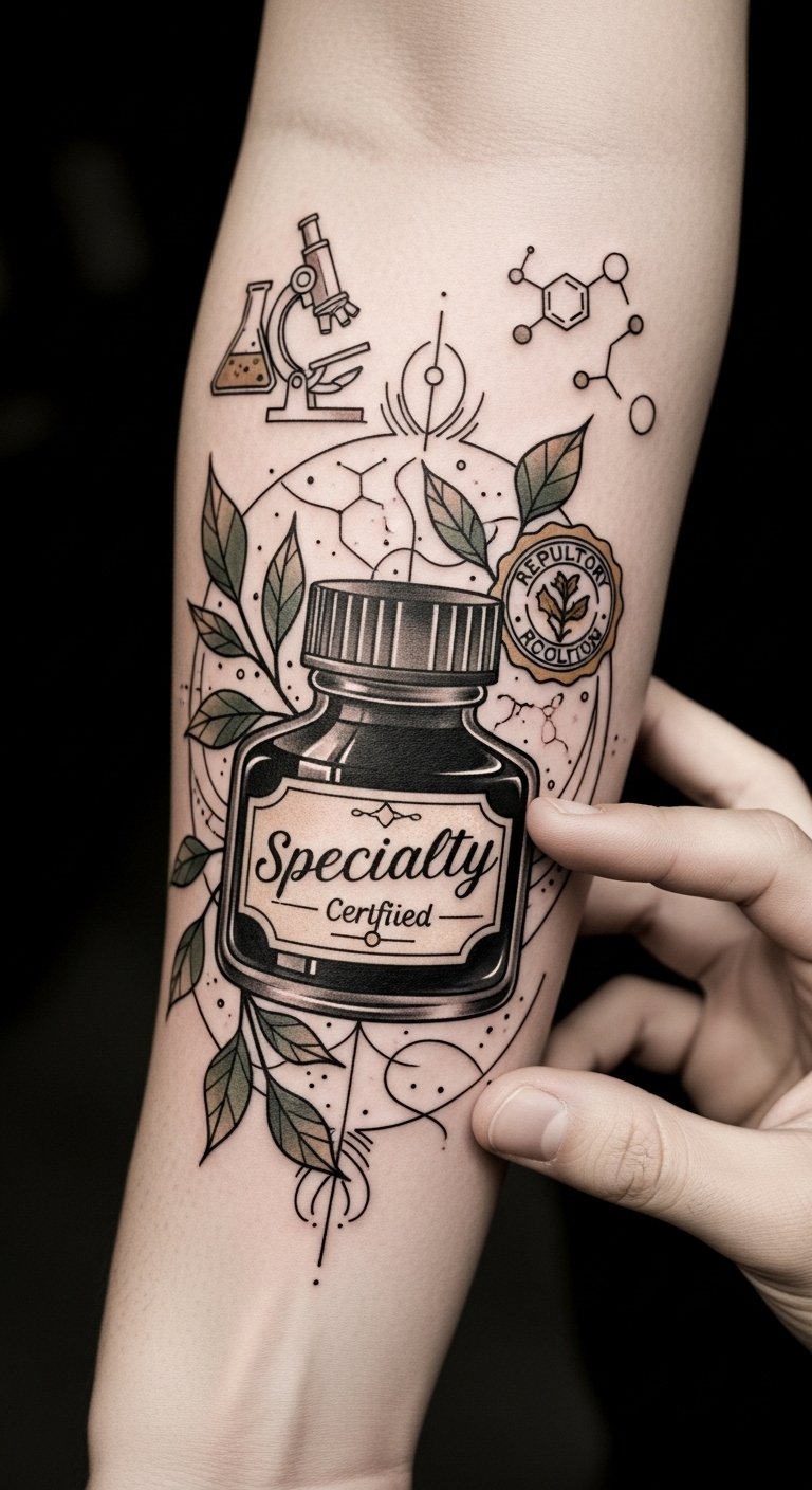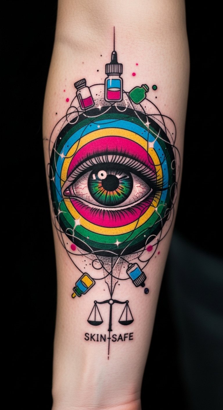 Emotionally it evokes curiosity tempered by caution—celebration of color alongside a reminder to be informed. Ideal placement on the forearm allows the ribboned composition to wrap naturally and be both visible for conversation and sized to include fine regulatory-text details; on the upper back it can expand into a more dramatic, symmetrical piece.