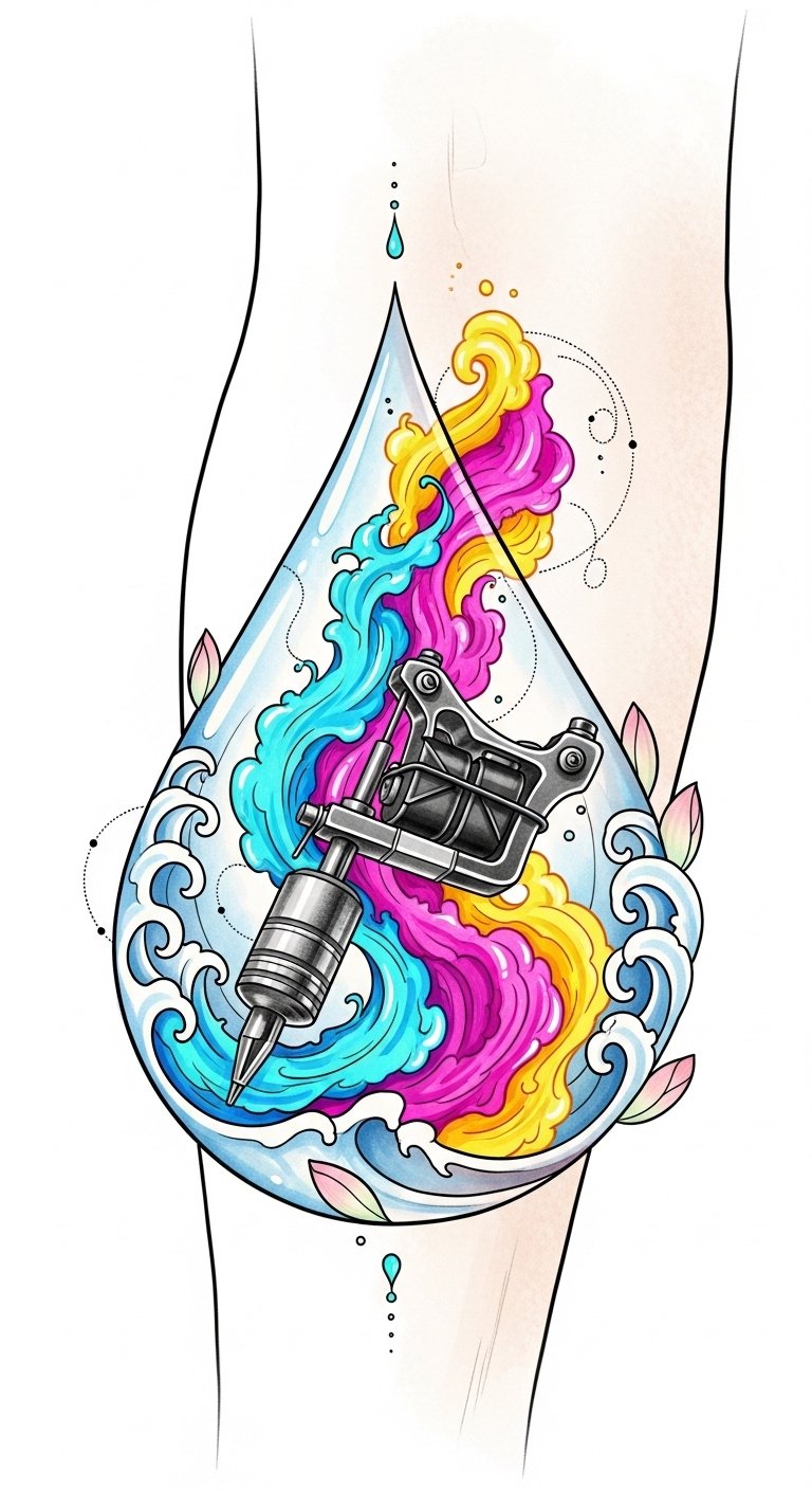 This design uses the droplet as a guardian motif — the tattoo machine and ink within represent creation and permanence while the split between vivid and faded halves visualizes the delicate balance between care and damage; lotus petals add resilience and renewal.
