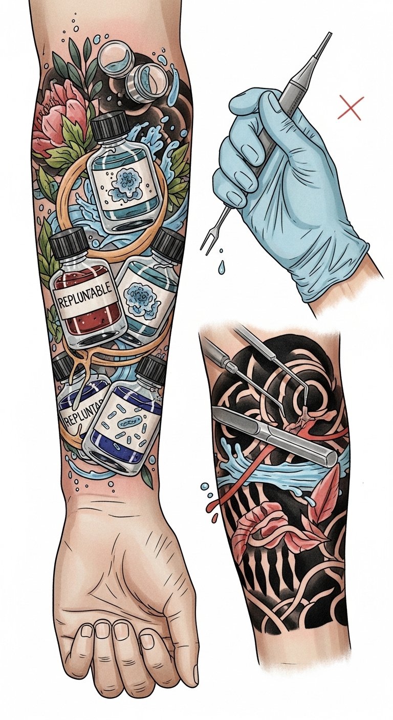 Emotional tone is reassuring and empowering, promoting informed choices. Ideal placement is the outer forearm for visibility and as a conversation starter about tattoo hygiene.