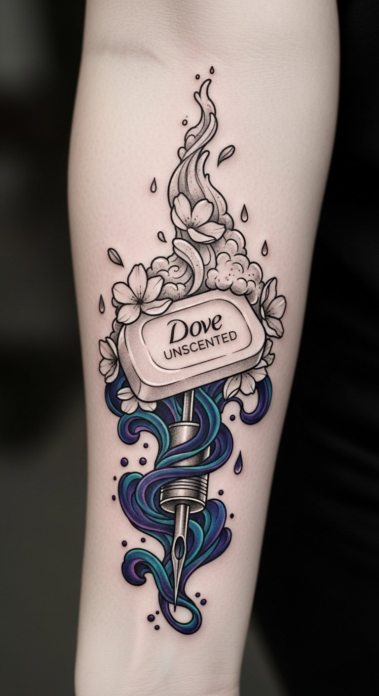 The design transforms the original lines into a visual narrative of care and healing: the Dove Unscented bar represents gentle protection, the foam-to-petal transition symbolizes moisture retention and absence of harsh fragrances, and the droplets forming a needle and ink imply attentive aftercare that preserves vibrant, lasting colors.