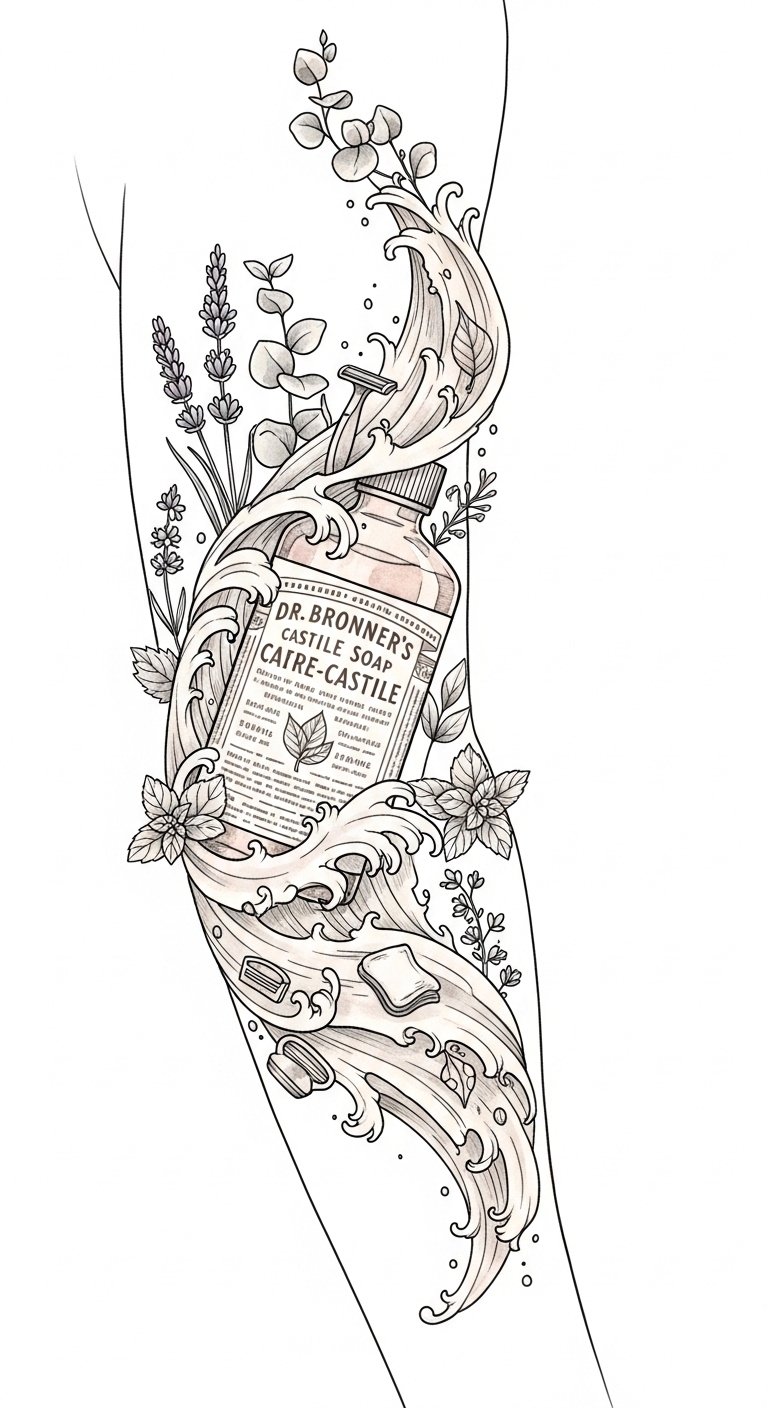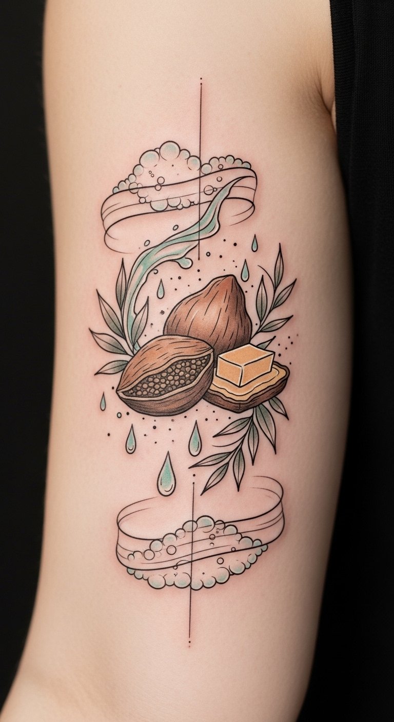 This tattoo melds imagery of nourishment and cleansing to symbolize self-care and recovery: the shea nut and butter evoke warmth, comfort, and resilience; the water droplets and foam suggest purification and the gentle rituals that prepare skin for change; the leaves represent natural ingredients and growth.