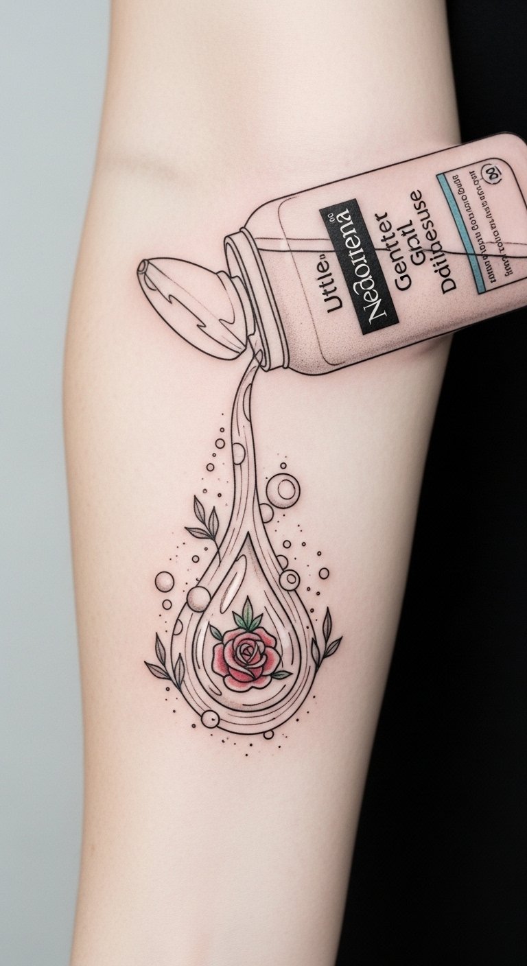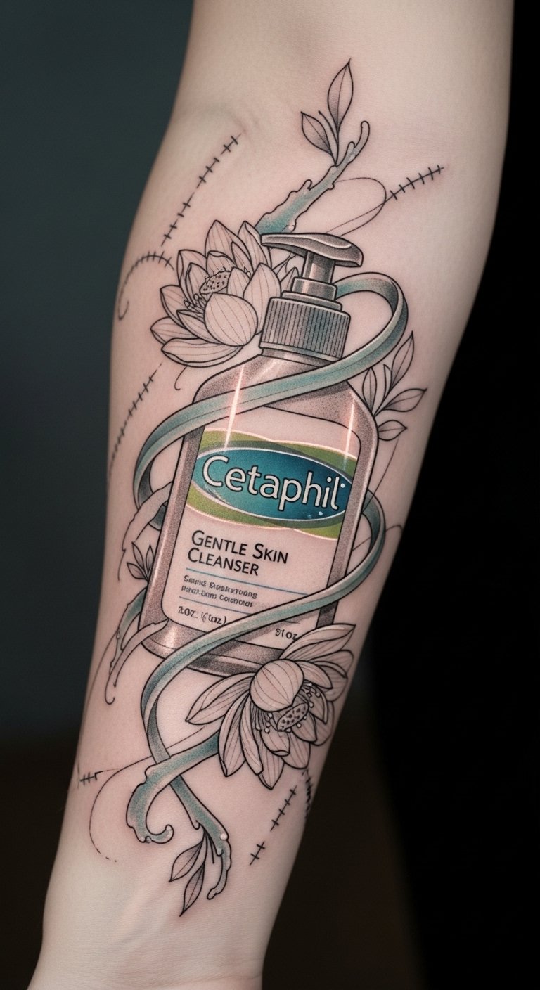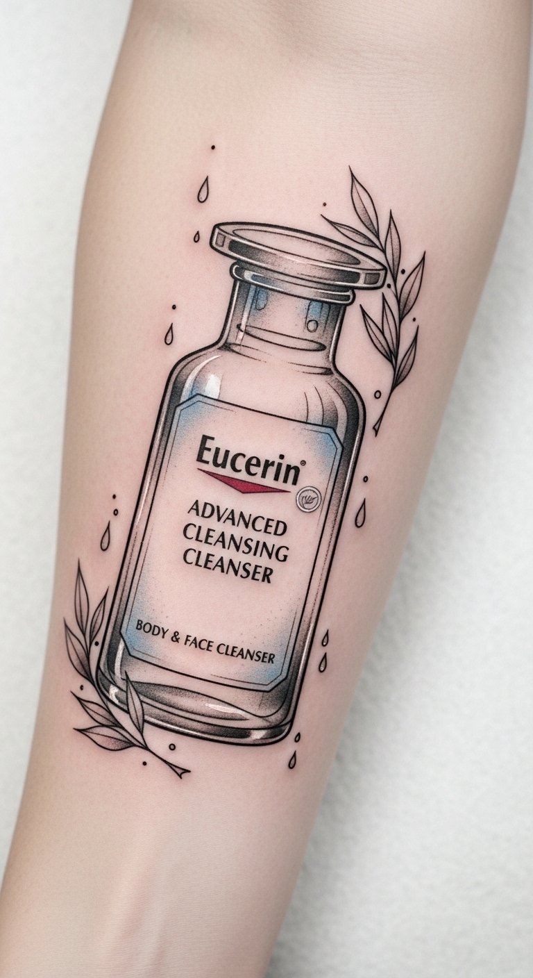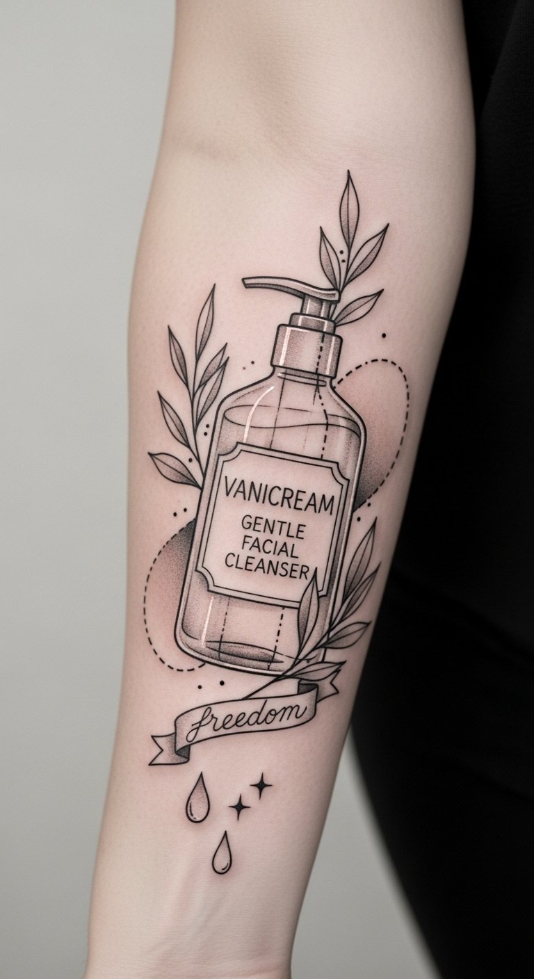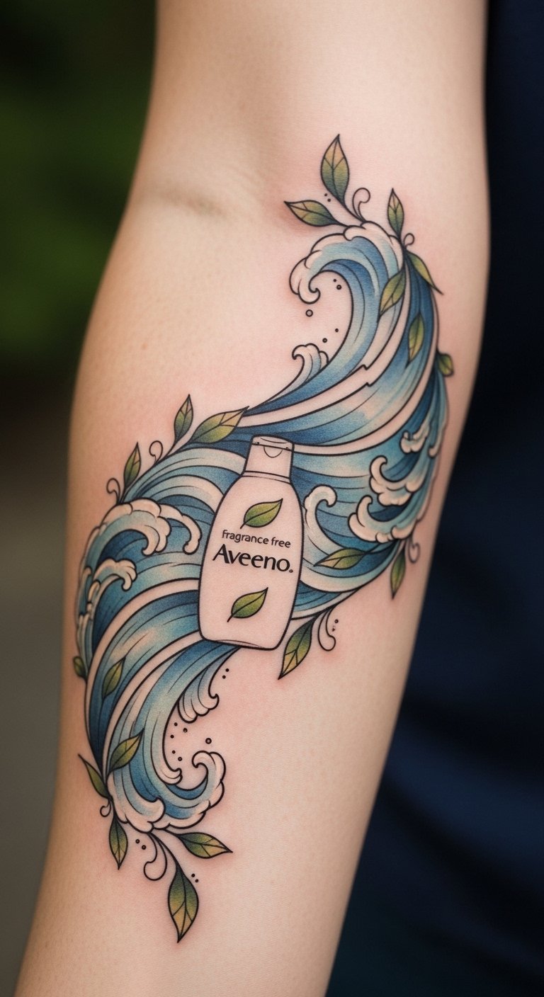 With natural formulations and fragrance-free options, daily use supports hydration and enhances tattoo aftercare, letting your body art shine beautifully. The design symbolizes ongoing care and renewal—the waves represent cleansing and movement, the leaves natural ingredients and healing, and the discreet bottle nods to the specific product that nurtures the piece; emotionally it conveys comfort and confidence, and placement on the inner forearm allows frequent visibility and personal ritual while being easily covered when desired.