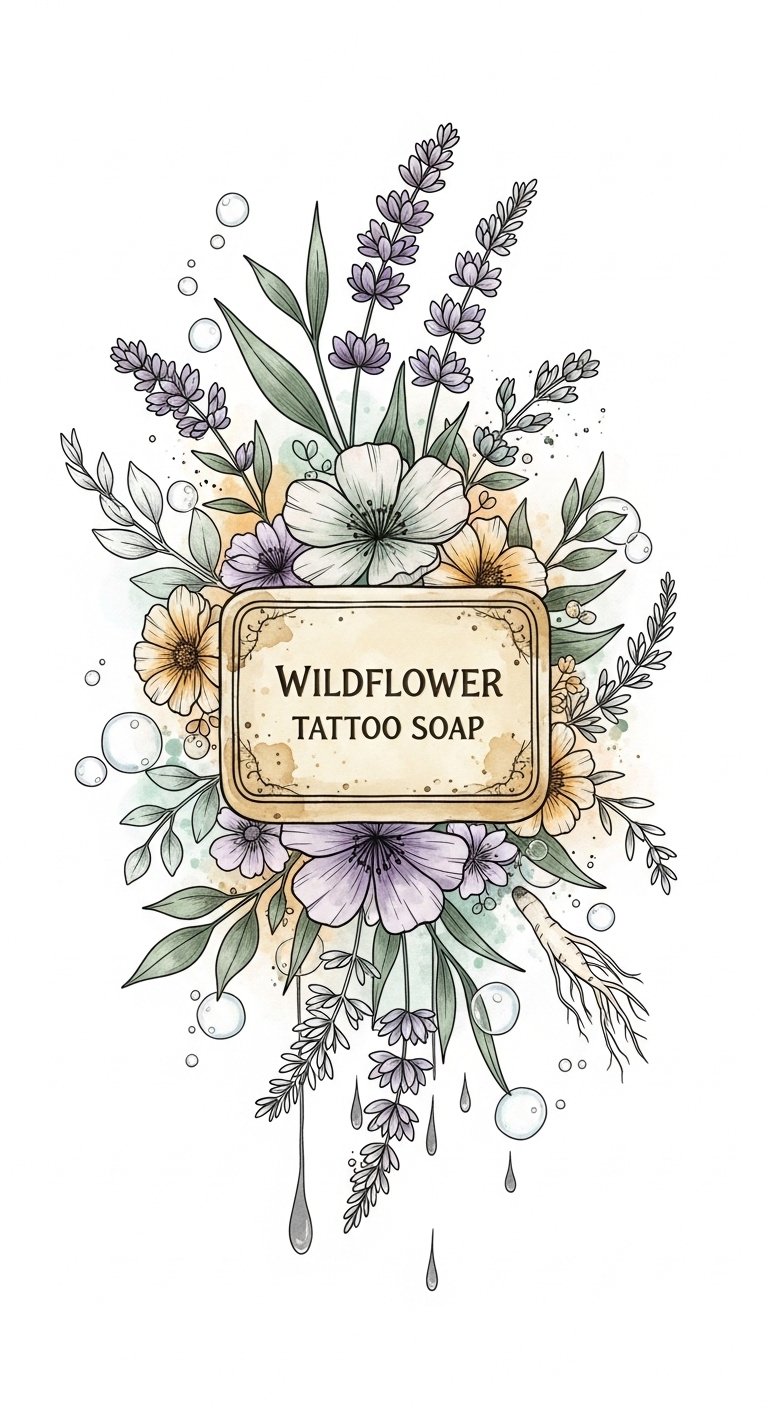 The design symbolizes gentle care and renewal, combining cleansing elements with botanical motifs to evoke protection and vibrancy; the soap bar and bubbles represent cleansing and healing, the wildflowers and roots signify natural ingredients and the flourishing of body art, and the ink droplets suggest the preservation of color and life.