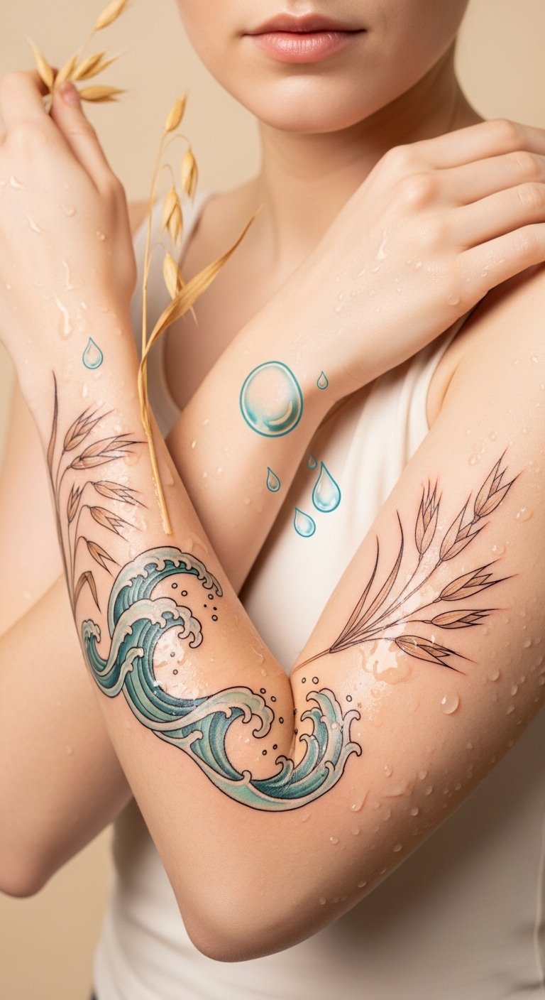 A flowing tattoo design that intertwines oceanic motifs—gentle blue-green waves, foam-like white highlights, and delicate botanical elements—symbolizes cleansing, healing, and artistic preservation. The imagery evokes calm, protection, and renewed vibrancy, suggesting both physical care and creative freedom; ideal placement is along the forearm or upper back where the wave movement can follow natural contours and be showcased with color and fine detail.