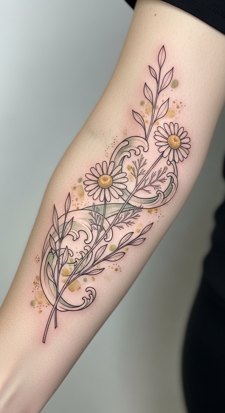 The tattoo uses chamomile blooms to symbolize calm and soothing, while the soap bark branches represent natural cleansing and gentle strength; the stylized cleansing wave conveys renewal and the removal of impurities, letting vibrant personal meaning shine through.