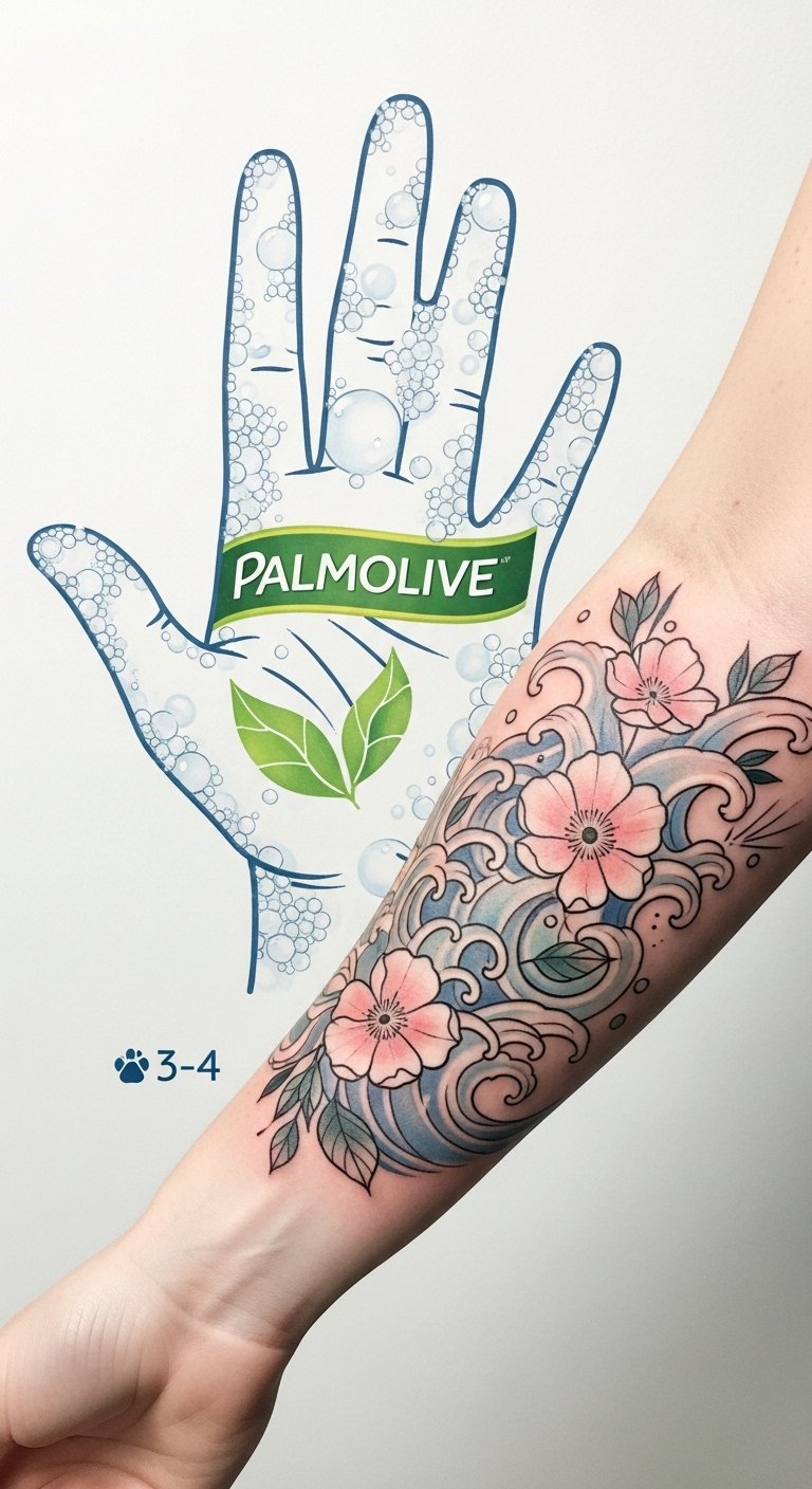 Palmolive Ultra Gentle Foaming Hand Wash offers an ideal solution for tattoo aftercare with its soft, rich lather and soothing formulation. You’ll experience palmolive benefits through its gentle cleansing, which effectively removes impurities without irritating your skin. This makes it perfect for keeping your new ink vibrant and healthy. Embrace the freedom of caring for your tattoo with a wash that truly understands your skin’s needs. The design symbolizes protection and gentle care—the cradling hand and foam represent cleansing and nurturing; flowers and waves suggest healing, renewal, and longevity of color. Emotionally it conveys calm, trust, and tenderness; ideal placement on the inner forearm allows visibility for personal reassurance while remaining private enough for healing.