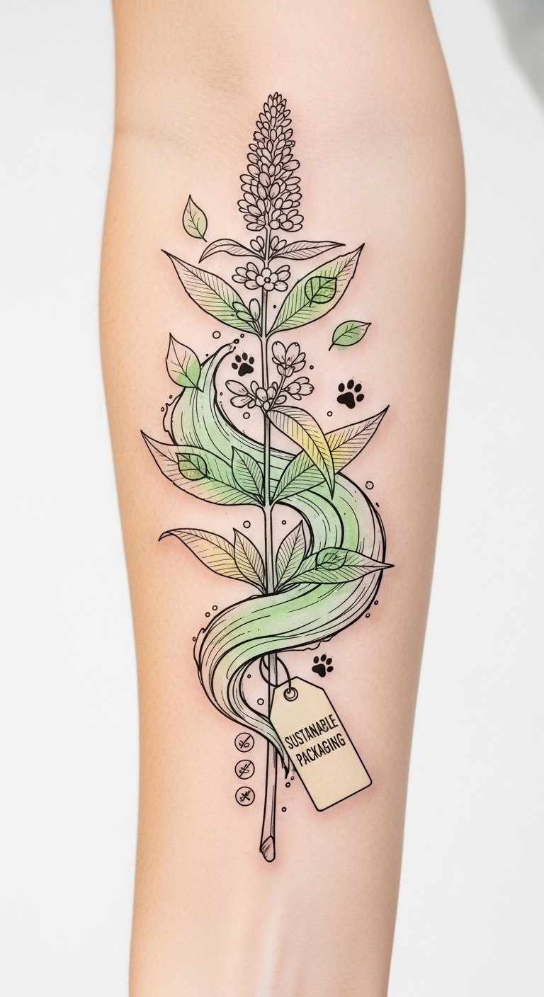 Hidden biodegradable leaves and paw prints express eco-consciousness and compassion, and the packaging tag acts as a reminder of sustainability.