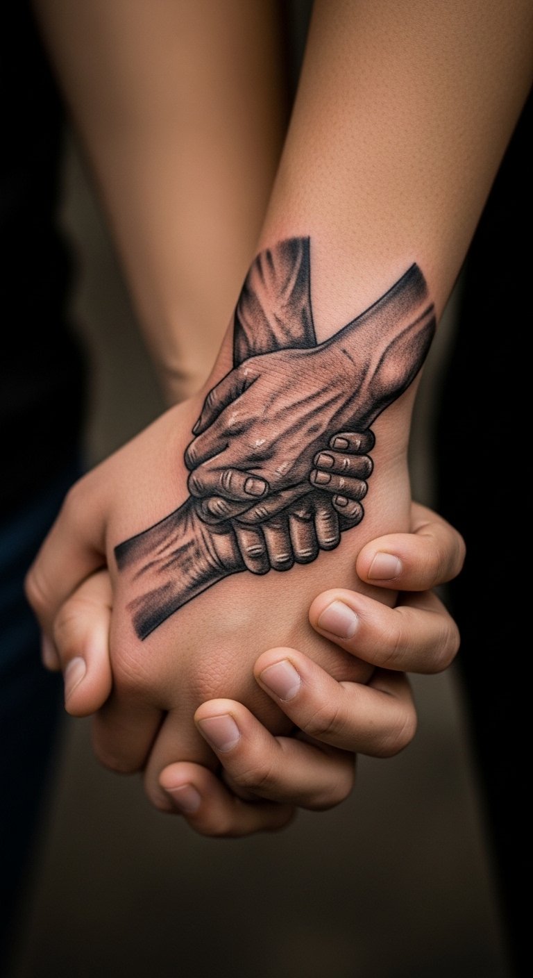 When placed along the inner forearm, wrist, or collarbone, this holding-hands tattoo becomes an intimate reminder of connection and resilience; delicate linework and subtle shading emphasize interlaced fingers while small personalized elements (birth flowers, initials, or tiny constellations) can be woven into each finger to represent individual family members.