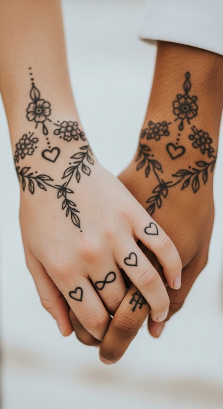 Incorporating hearts, infinites, and flowers into a holding-hands tattoo deepens the narrative: hearts for affection and commitment, infinity loops for timelessness, and specific blooms (roses for passion, lavender for calm) to mark personal milestones.