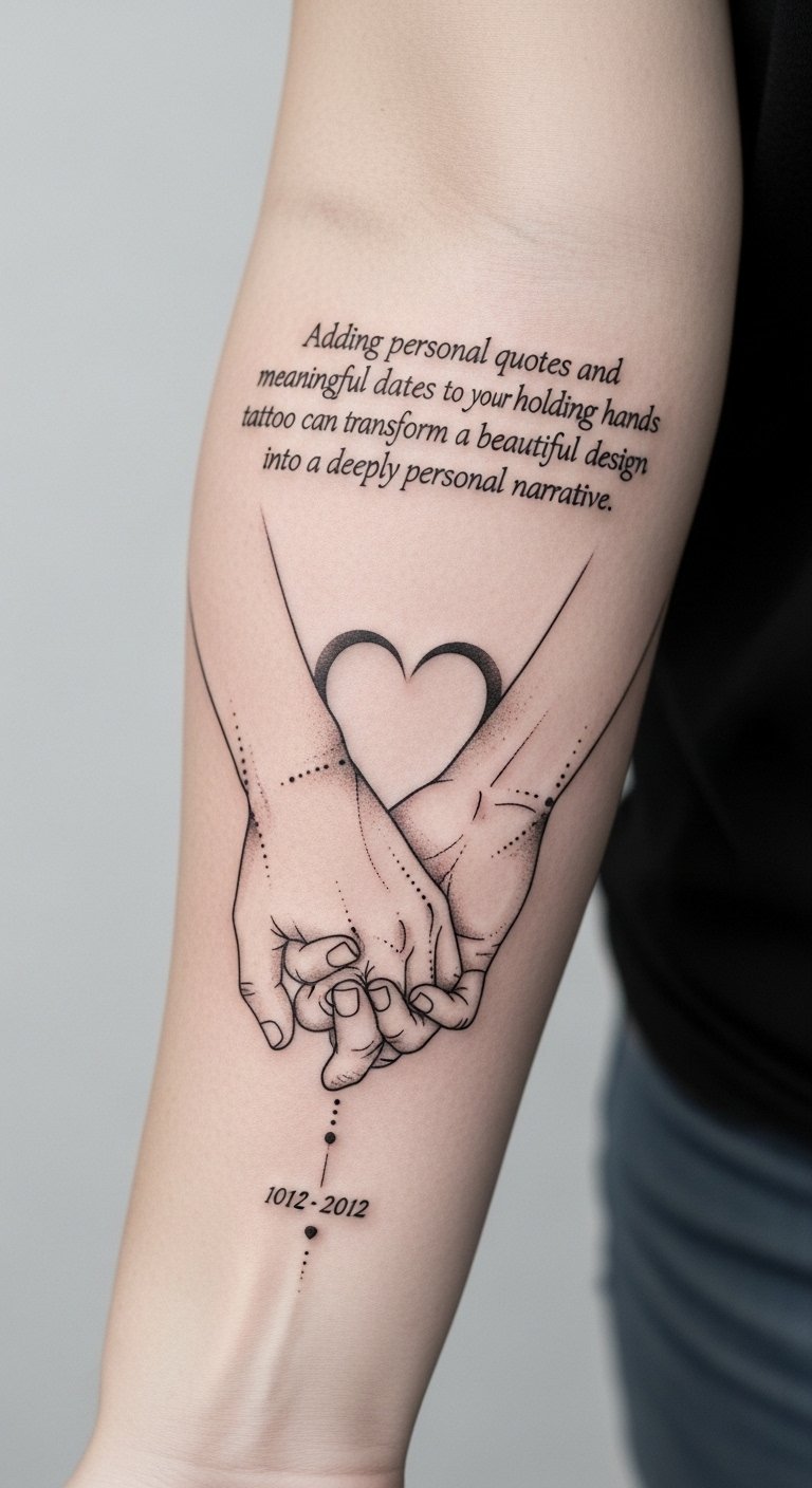 Adding personal quotes and meaningful dates to your holding hands tattoo can transform a beautiful design into a deeply personal narrative.