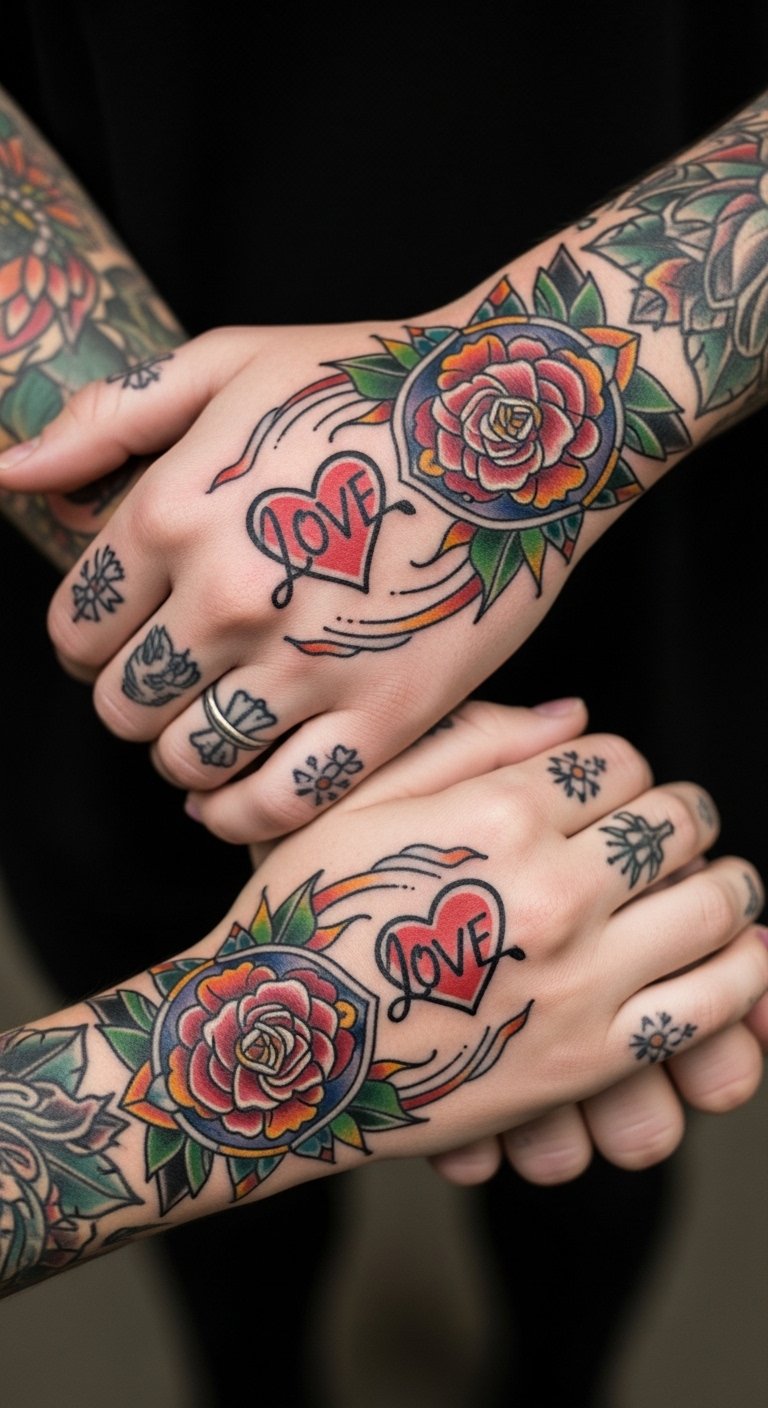 This concept uses classic neo-traditional motifs—roses, hearts, and stylized swallows—rendered with saturated reds, deep teals, and warm golds framed by thick black outlines to read clearly on the hand.
