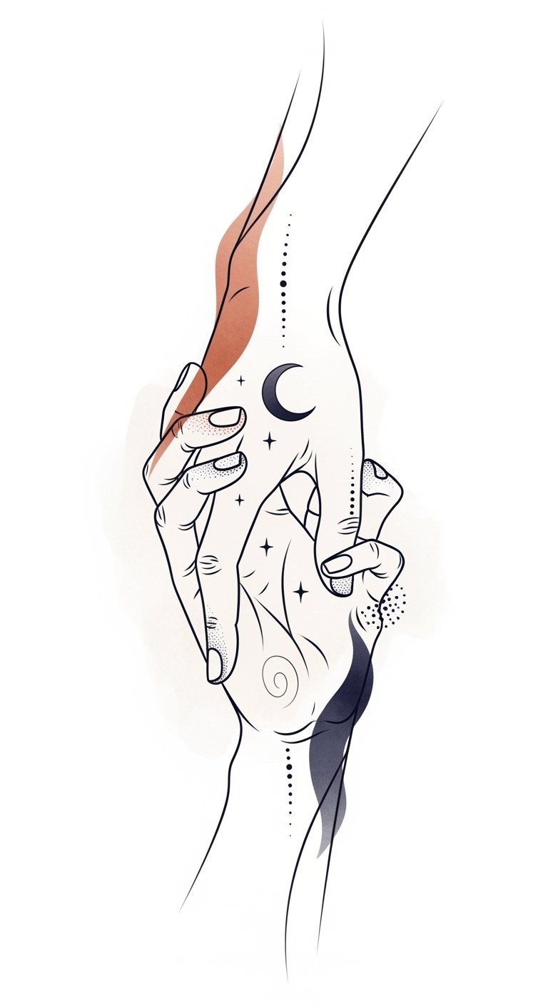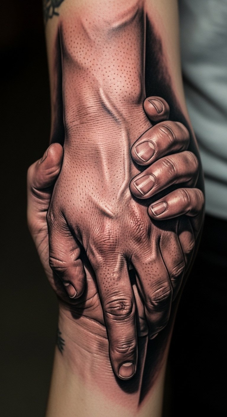 This design concept uses two hands—one gently cradling the other’s wrist—in hyperrealistic detail, focusing on skin texture, fine lines, and subtle shadows to convey intimacy and trust; placed along the forearm or over the heart, the piece symbolizes support, enduring connection, and liberation through unity, evoking warmth and a quiet emotional strength that reads like a personal vow every time you see it.