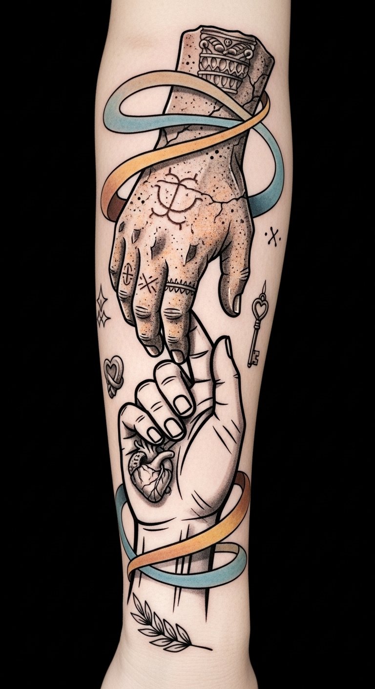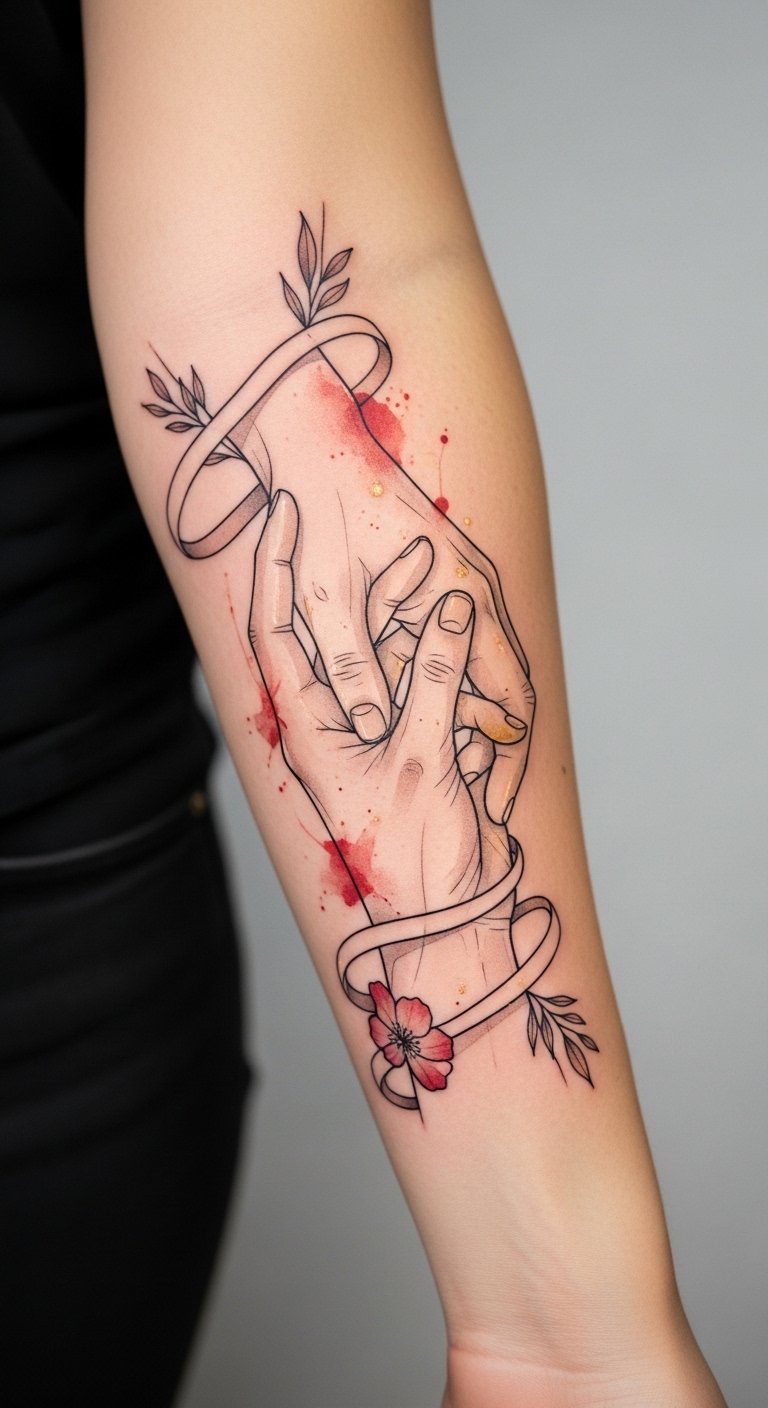 The composition symbolizes unity and protection—the larger hand representing support, the ribbon as continuity and commitment, and the botanicals as growth; emotion conveyed is tender intimacy and proud openness, best placed along the outer forearm where movement makes the hands appear to gently reach toward others, visible enough to spark connection yet intimate in detail for those who come close.