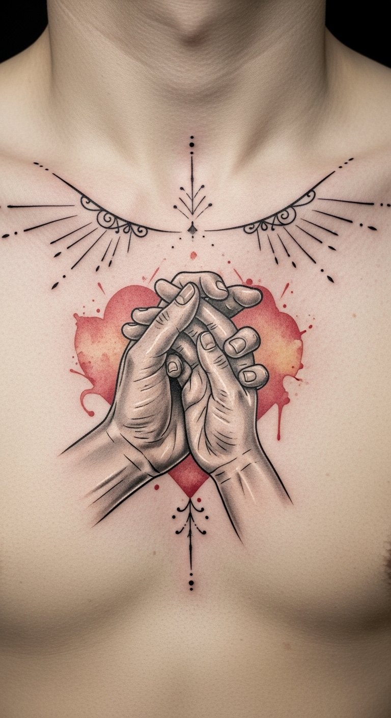 The chest area serves as a powerful canvas for tattoos, rich with symbolism and meaning. A chest tattoo showcasing holding hands embodies love symbolism, representing unity, connection, and deep emotional bonds.