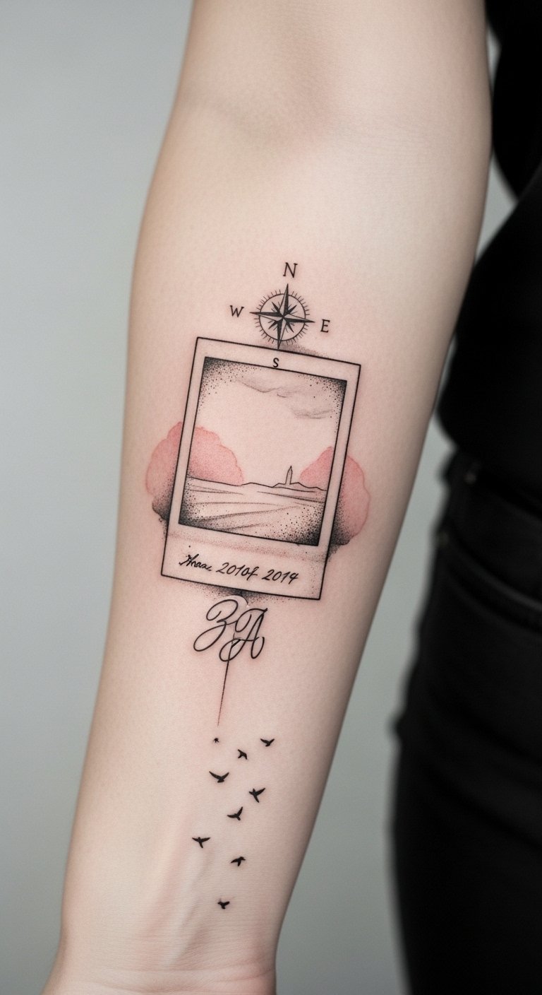 When you glance at these tattoos, you’ll feel the warmth of those moments, celebrating the essence of freedom and connection that love brings. The Polaroid symbolizes preserved memories, the compass rose marks journeys taken together, the intertwined initials denote union and personal history, the watercolor blush suggests the warmth of emotion, and the tiny birds convey freedom and ongoing movement;