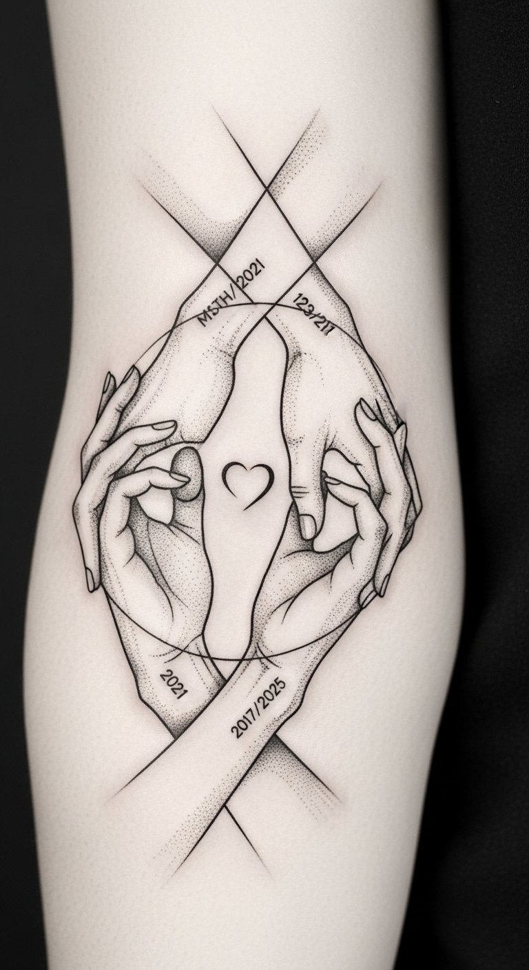 This placement evokes intimacy and tenderness—inner forearm for daily visibility and shared glances, ribcage for private meaning—and the intertwined hands symbolize unity and mutual support while the embedded phrase and dates anchor specific memories and milestones.