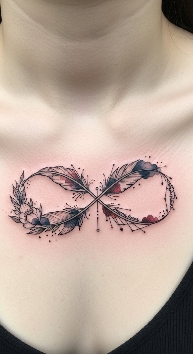 This placement works beautifully on the inner forearm, wrist, or near the collarbone where the image can be seen and felt; the infinity bracelet and feather ring emphasize continuity and personal liberty, while the muted watercolor wash conveys tenderness and calm.