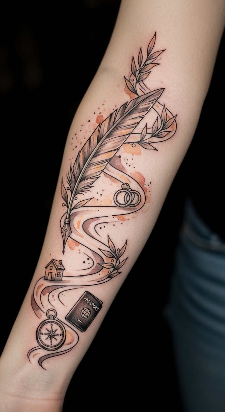 Embrace your journey! The quill represents authorship of your own story, the winding path shows continuous growth, and the milestone icons mark concrete memories; laurel leaves honor achievements while watercolor hues evoke emotion—best placed along the forearm to read sequentially and easily expand with future chapters.