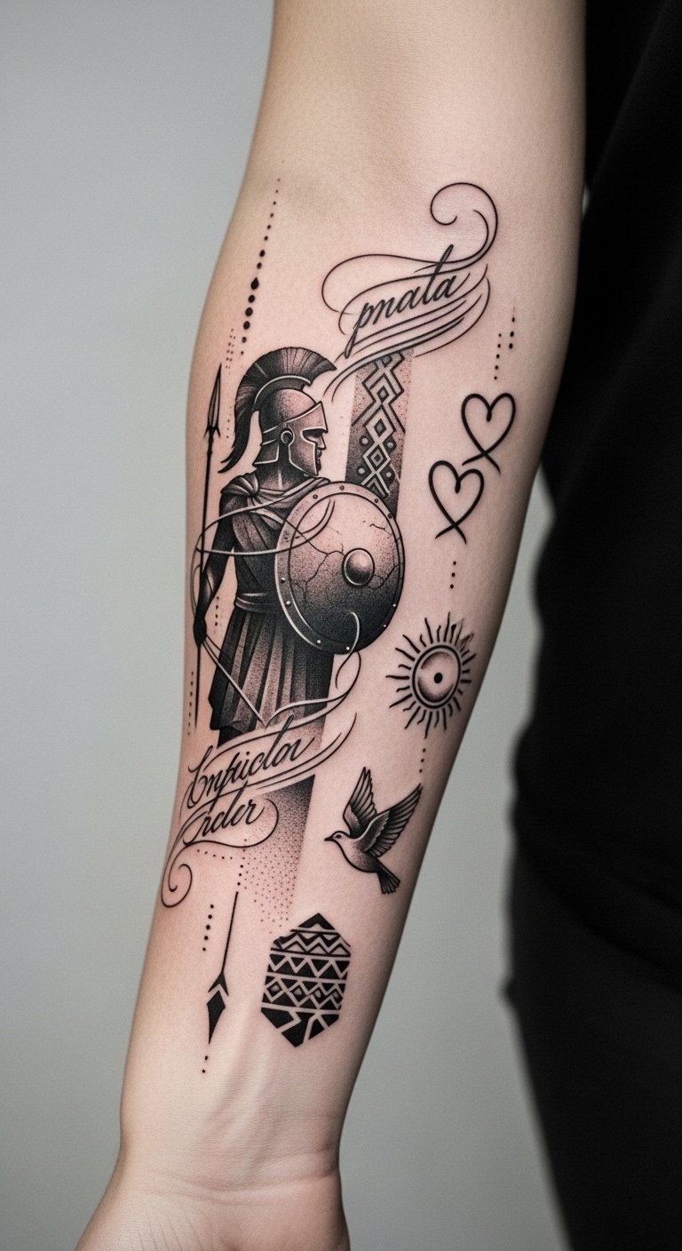 The concept uses the original passage as its narrative core: the warrior silhouette and cultural motifs symbolize identity and status, the entwined hearts and vines evoke bonded lovers and personal expression, the sun disk and bird suggest freedom and the spirit’s longing; placed along the forearm the composition reads as a journey, meant to feel intimate and empowering, with linework and shading chosen to elicit warmth, reverence, and continuity.