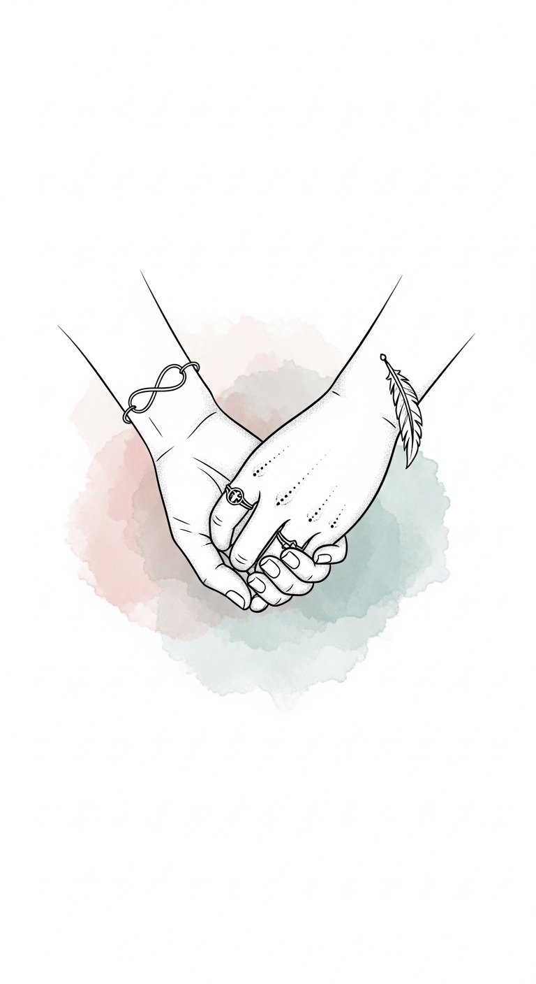 The design shows two interlocked hands rendered in a fusion of fine-line realism and delicate watercolor washes: warm skin tones with soft blushes of pink and amber around the contact points, and faint, flowing pigments trailing outward to suggest shared energy. Subtle details—freckles, veins, and a thin matching bracelet—personalize the pair, while negative space shapes a small heart between their thumbs. Symbolically this piece speaks to unity, mutual support, and the quiet intimacy of partnership; emotionally it evokes warmth, trust, and enduring closeness. Ideal placements include the inner forearm for visibility and daily reminder, the ribcage for a private keepsake, or the side of the hand/wrist to emphasize tactile connection.
