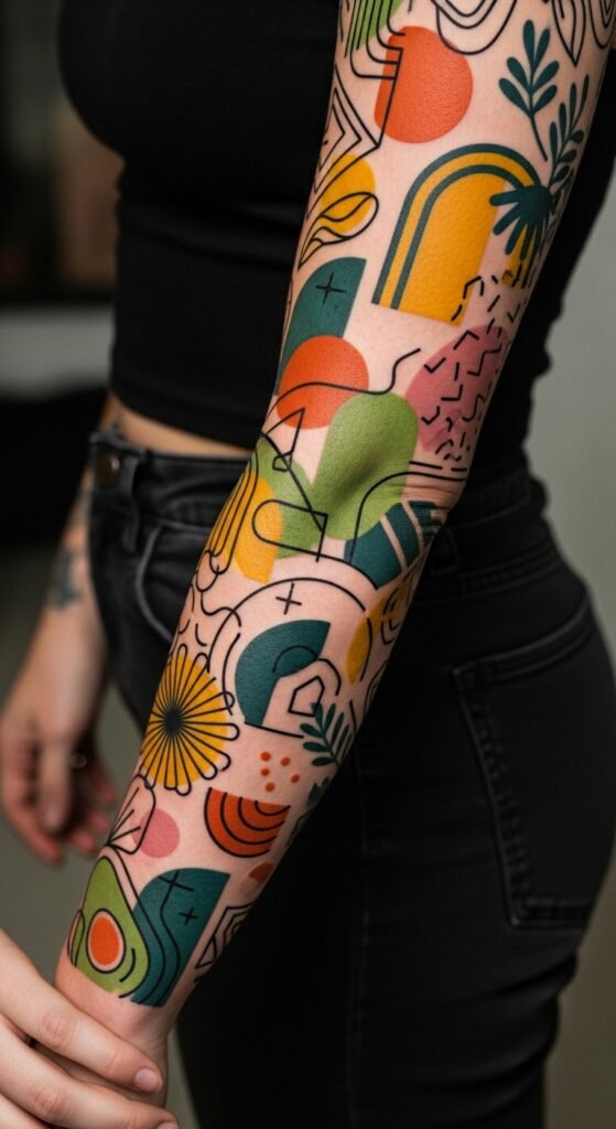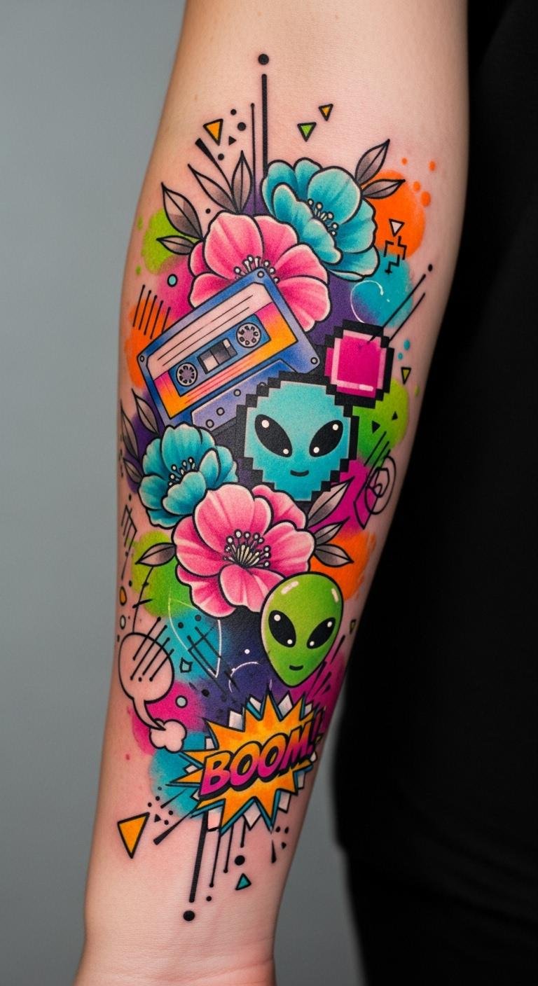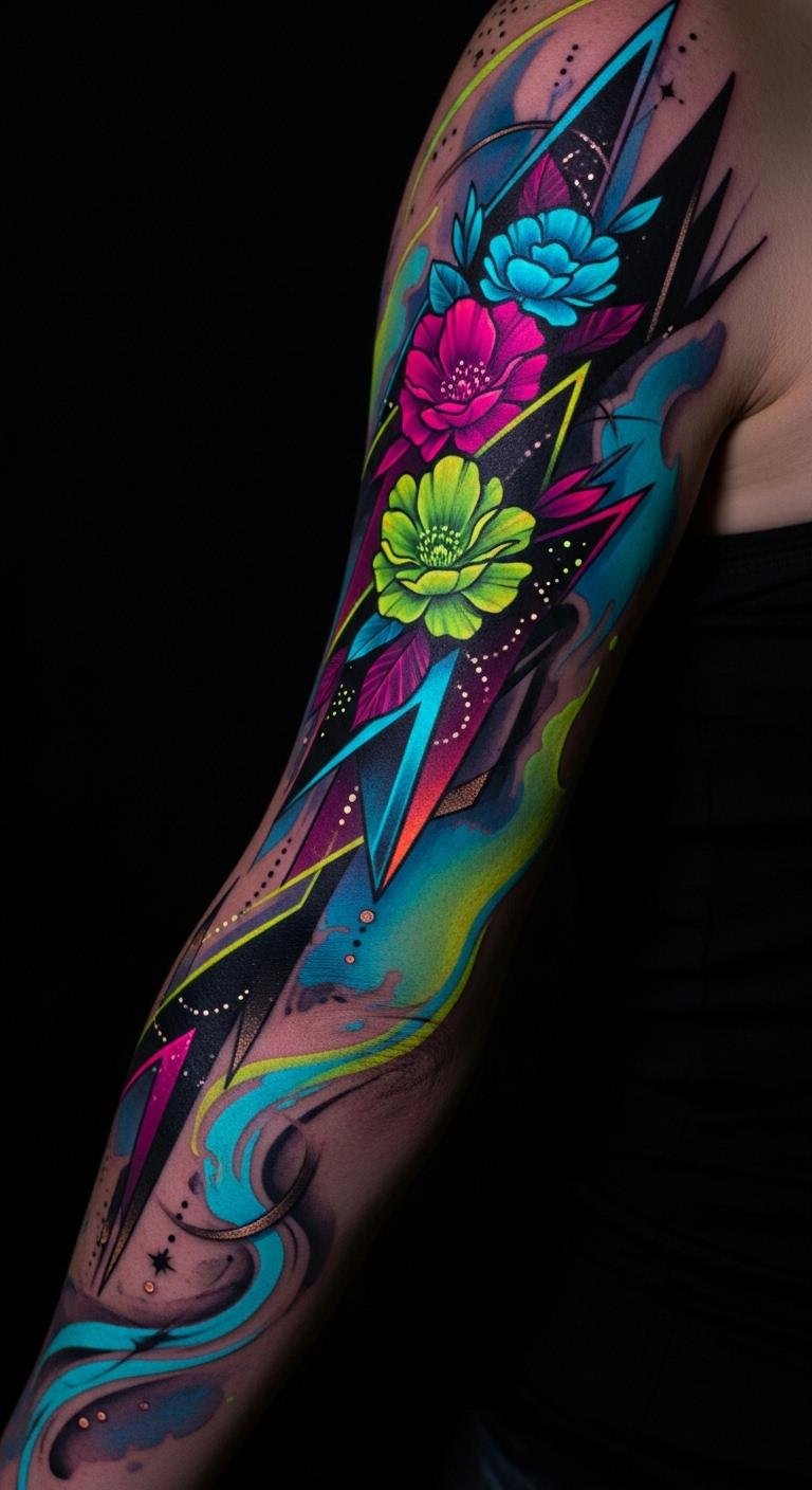 This design uses neon florals and geometric shards to symbolize growth breaking through structure. The watercolor washes convey emotional fluidity, and negative-space constellations represent personal milestones; emotionally it balances empowerment with vulnerability, ideal for a full forearm-to-shoulder placement where the flow follows muscle lines and can be shown or concealed as desired.