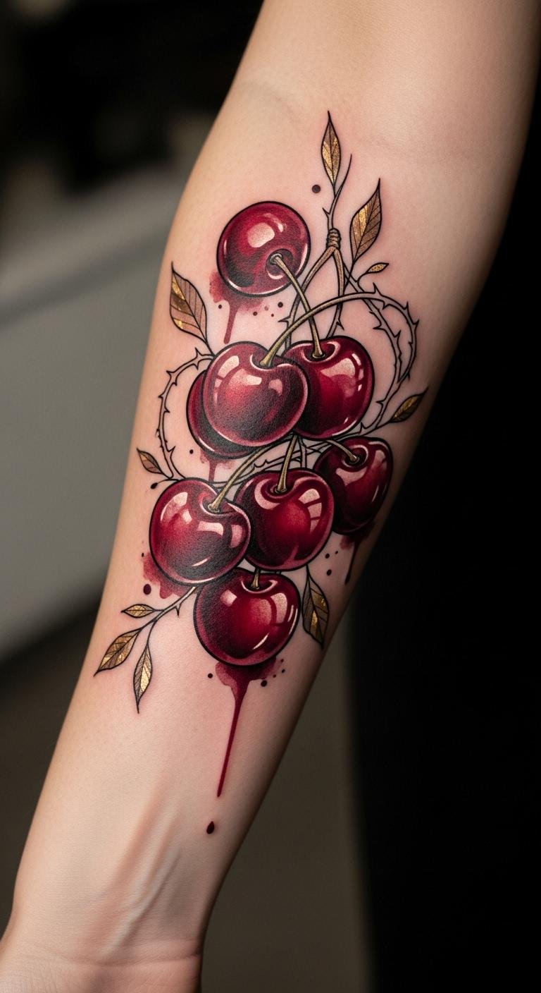 The vibrant cherry symbolism embodies passion and importance, making it a perfect fit for bold placements like the forearm or thigh.