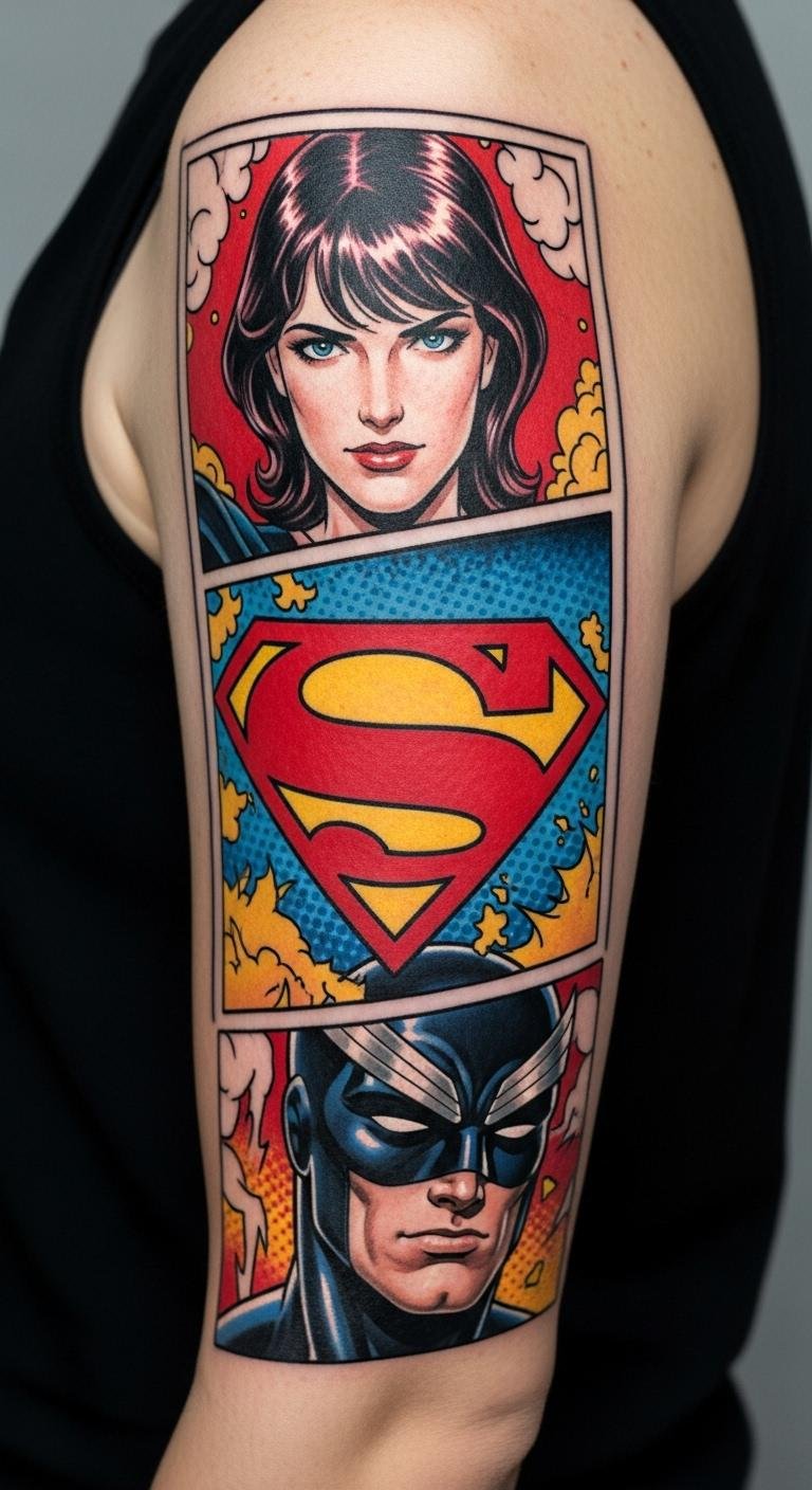 A tattoo design that uses layered panels and halftone textures to echo printed comics, combining a central superhero emblem or character portrait with surrounding fantasy motifs in saturated primaries and neon accents; symbolism centers on empowerment (bold reds), hope and clarity (bright blues), and wonder (vivid yellows), creating an energetic emotional palette; ideal placement: forearm sleeve or upper back where the sequential-panel layout and vibrant colors can read clearly and wrap with body movement.