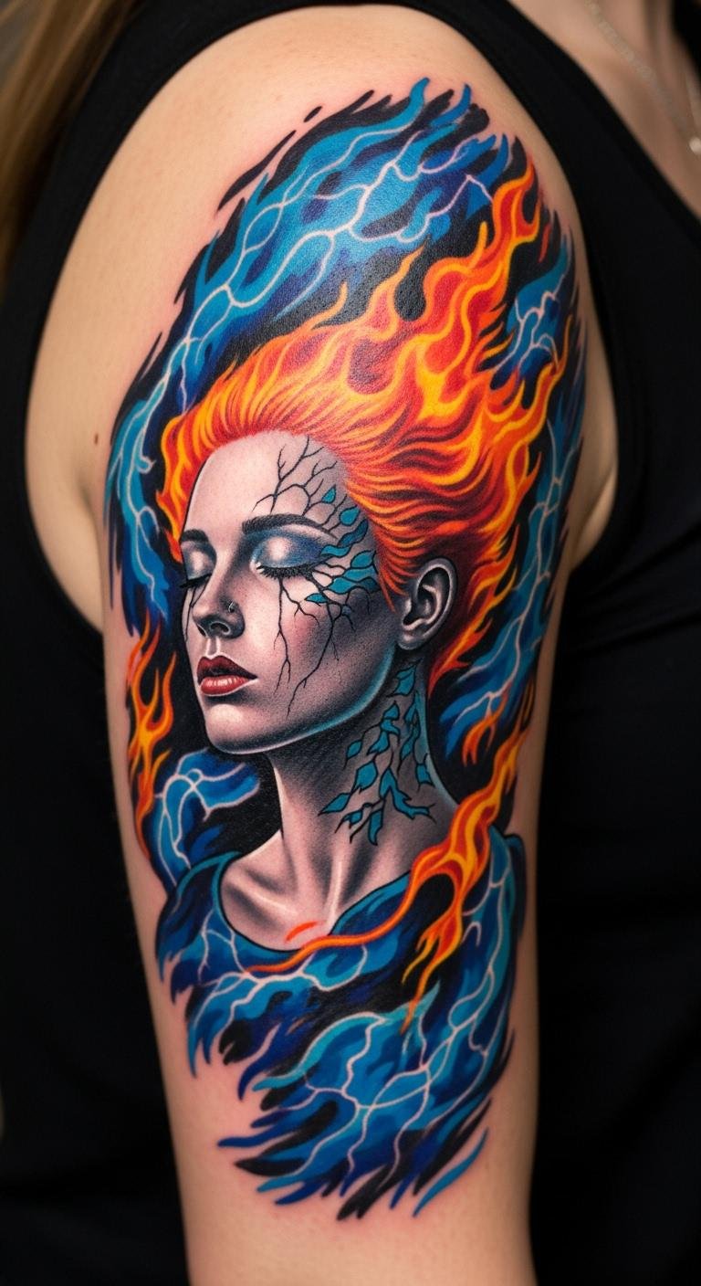 Ideal placement is the upper arm for visibility and movement or the upper back for a larger, more private canvas; the flowing composition follows natural musculature to emphasize motion and personal empowerment.