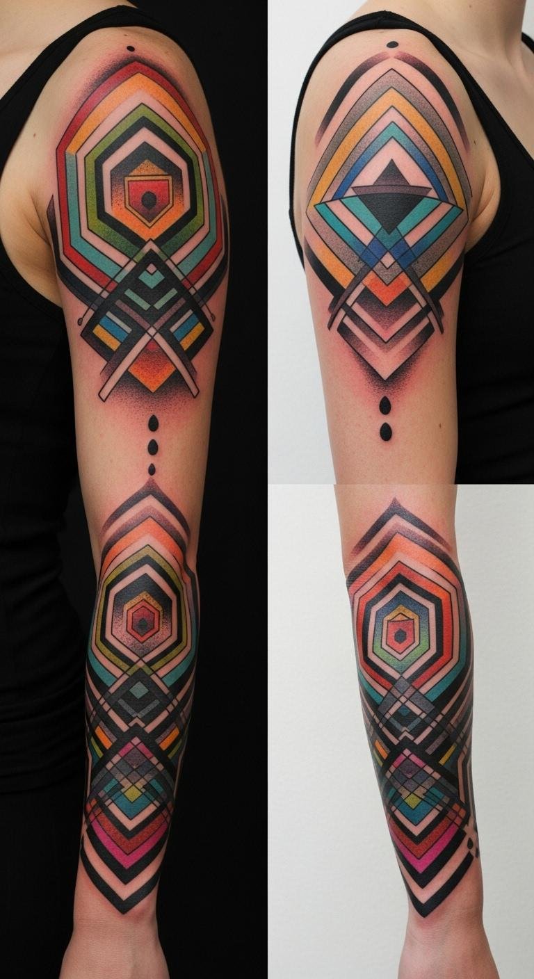 This tattoo concept uses the original phrasing as a literal blueprint: bold black lines form interlocking hexagons and triangles filled with vivid color blocks and delicate dotwork to evoke balance and movement. Symbolically, the repeating geometry represents order and personal alignment, while the vibrant palette and open negative spaces express freedom and individuality; emotionally it reads energetic and uplifting. Recommended placement depends on scale and visibility—forearm wrap for a dynamic, everyday statement; upper back centered for a more private, symmetrical anchor; calf sleeve for elongated motion—each location complements the design’s flow and the body’s natural lines.