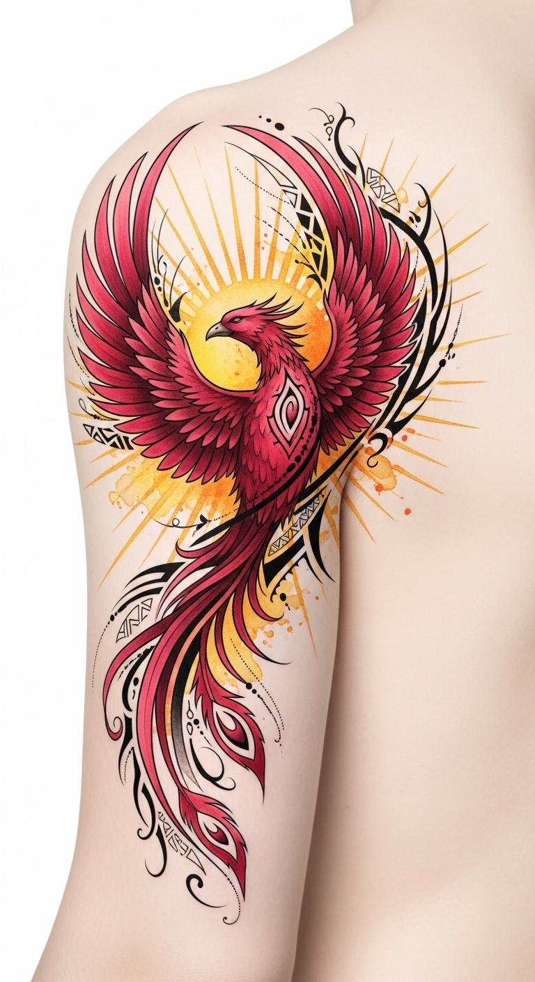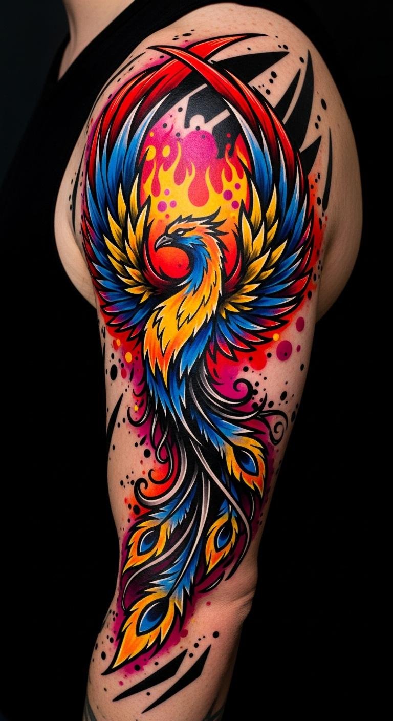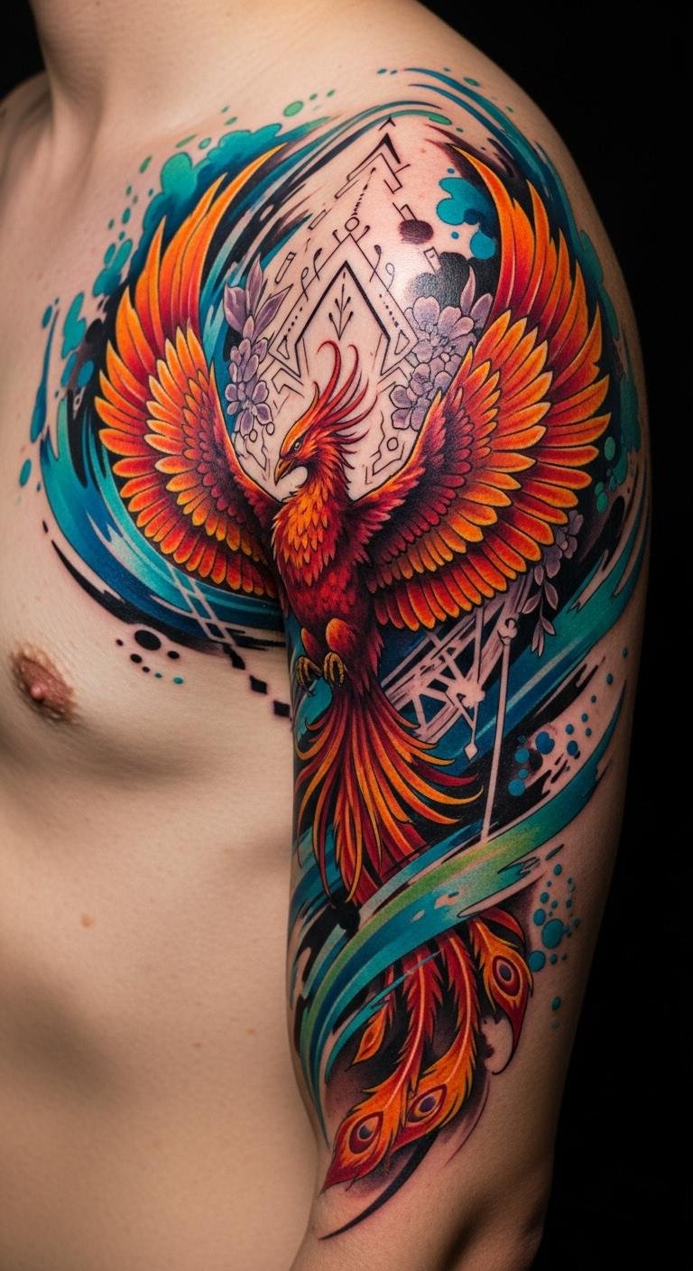 This placement centers the powerful phoenix over the heart and spreads outward across the shoulder and clavicle, symbolizing rebirth, courage, and visible transformation. The brushstrokes and watercolor splashes evoke emotional intensity and creative freedom, while geometric accents ground the piece with personal structure—ideal for someone who wants a striking, confident statement that reads from both close and at a glance.
