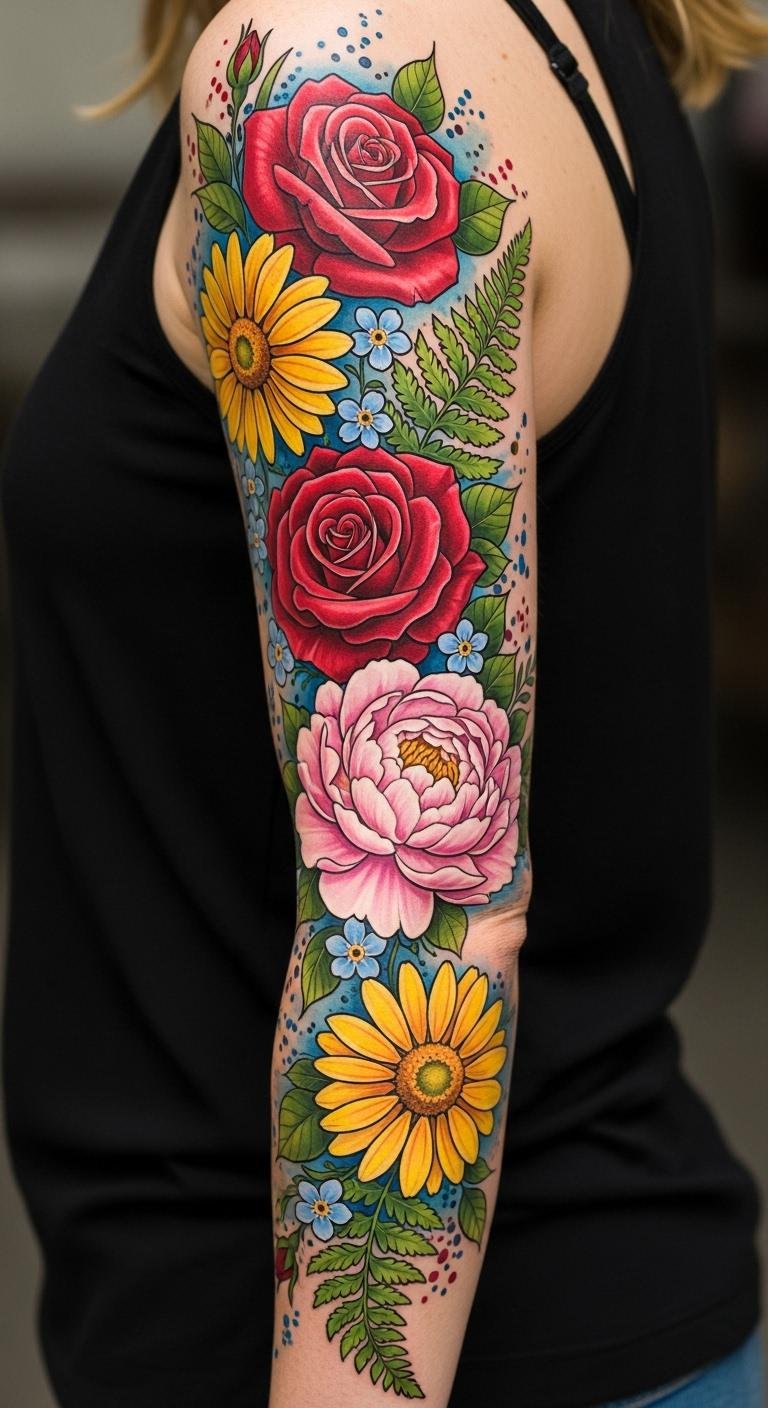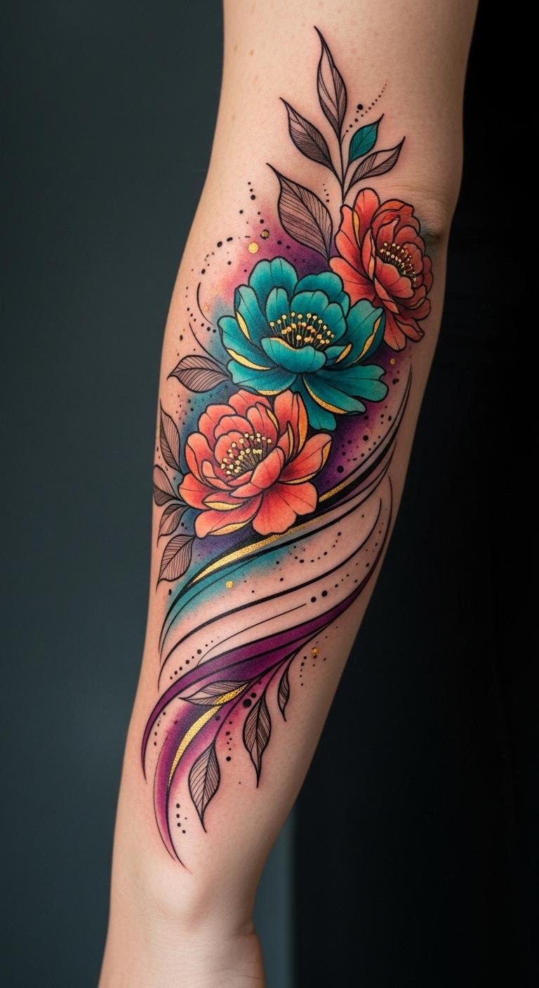 The watercolor texture softens emotions while bold outlines keep clarity over time; highlights and dynamic petal movement evoke liveliness and motion. Ideal placement is a full arm sleeve where the composition can wrap and flow with muscle contours, allowing larger blooms on the shoulder and forearm with smaller accents near the wrist for balance and visual storytelling.