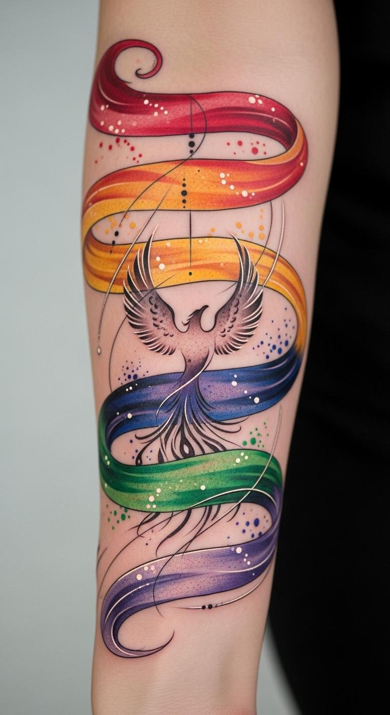 This design uses color bands and the negative-space phoenix to symbolize personal transformation: red for passion and courage, yellow for joy and optimism, indigo for introspection, green for growth, and lavender for serenity. The watercolor texture suggests emotional fluidity, while the intertwining ribbons represent how different feelings shape identity.