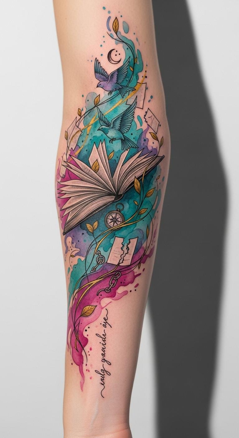 Watercolor hues reflect emotional highs and lows while gold highlights honor triumphs. Placed as a half-sleeve wrapping the outer and inner forearm, it guides the eye from wrist to elbow so the wearer can read and reveal chapters in motion, creating an intimate, empowering statement of identity.