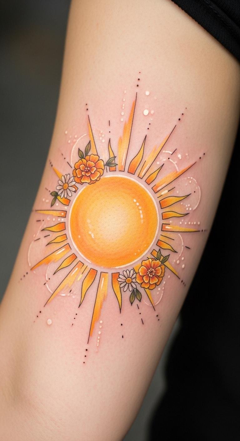 Whether it’s a radiant sun or playful flowers, each tattoo reflects a celebration of happiness and freedom, inviting you to express your inner light.