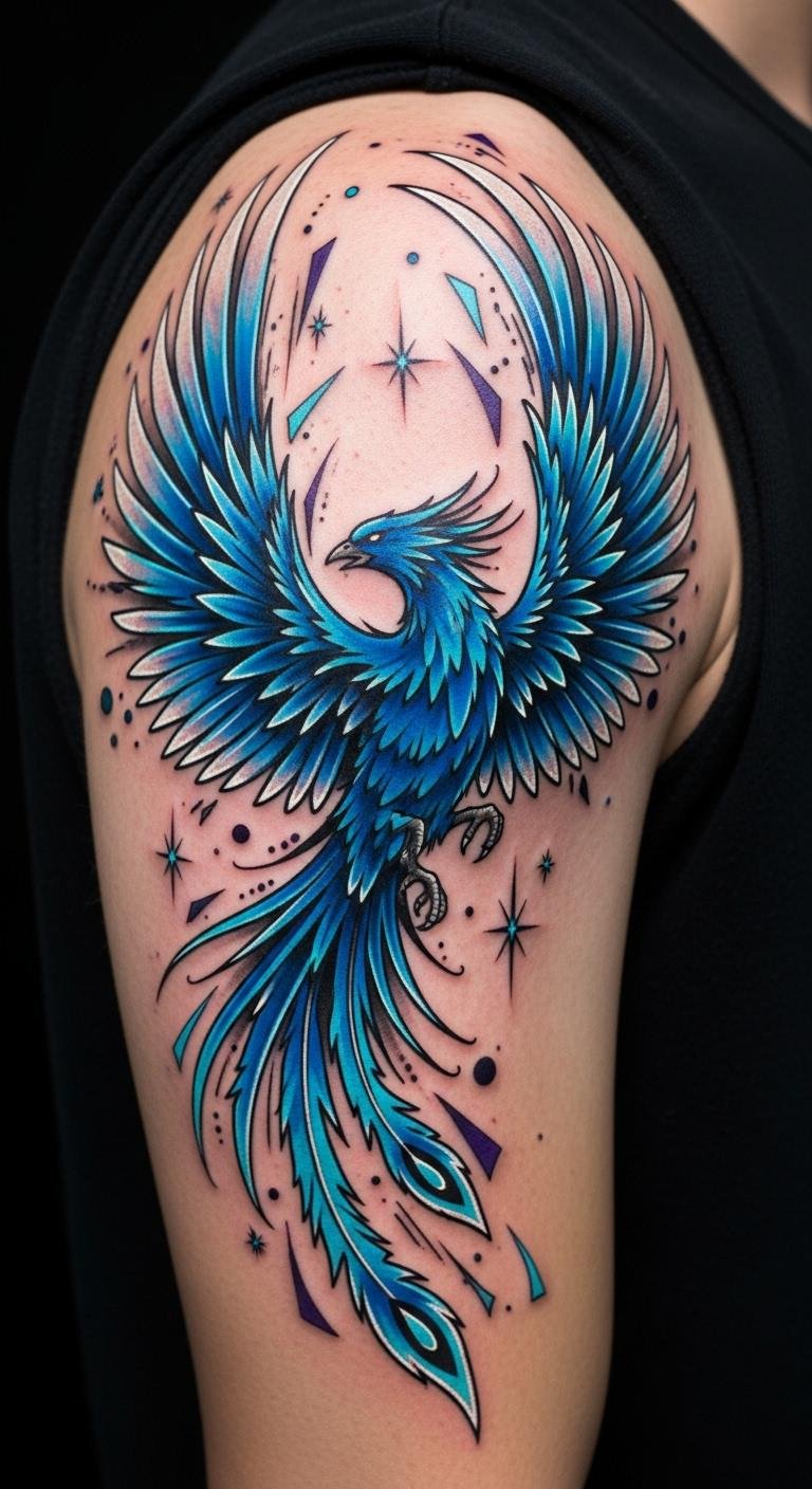 This design channels the original text’s emphasis on electric blue’s striking intensity by rendering it as a phoenix—symbolizing creativity, inspiration, freedom, adventure, and a zest for life.