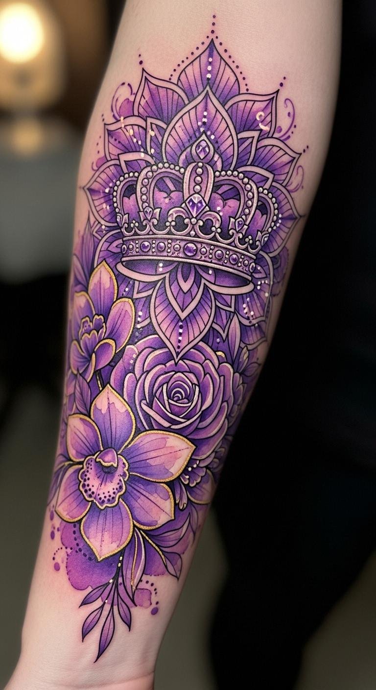 This design blends crown imagery with mandala geometry and lush florals to symbolize authority balanced with inner harmony; the violet palette conveys mystery, creativity, and spiritual depth while gold accents suggest nobility and warmth.