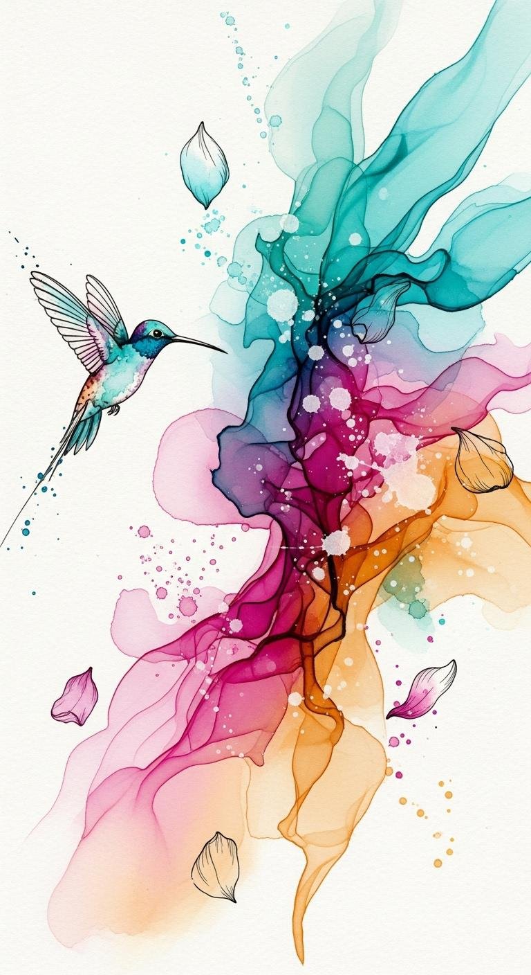 Let your imagination flow! The design symbolizes freedom, renewal, and the transitory beauty of emotion—hummingbird energy for lightness and motion, flowers for growth, and the fluid washes representing shifting feelings; emotionally it evokes joy, spontaneity, and gentle resilience.