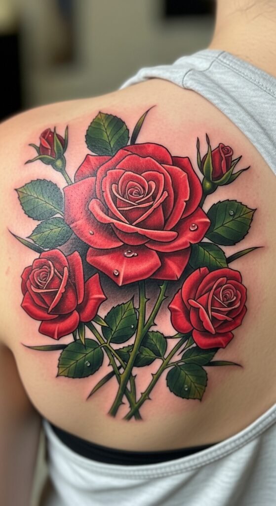 This design evokes deep love and sensuality through the lush red bloom and dew, balanced by fine-line thorns that suggest resilience; ideal for the forearm or shoulder where movement enhances emotion and the realistic style reads clearly from a distance.