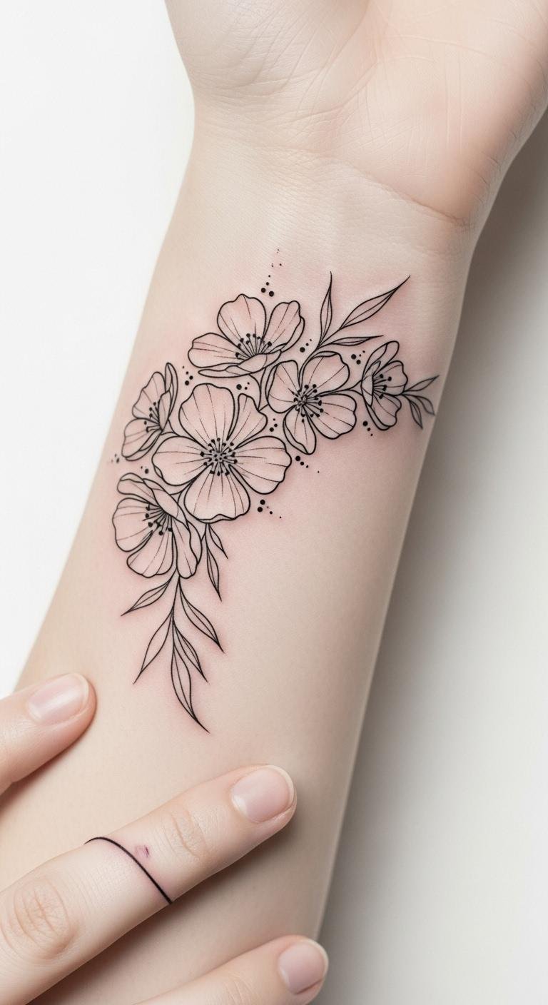 The design symbolizes quiet resilience and personal growth—wildflowers that thrive in small spaces—evoking calm, confidence, and a refined sense of self; ideal placements are wrist, collarbone, side of finger, or inner forearm where the soft curve enhances intimacy and everyday visibility.